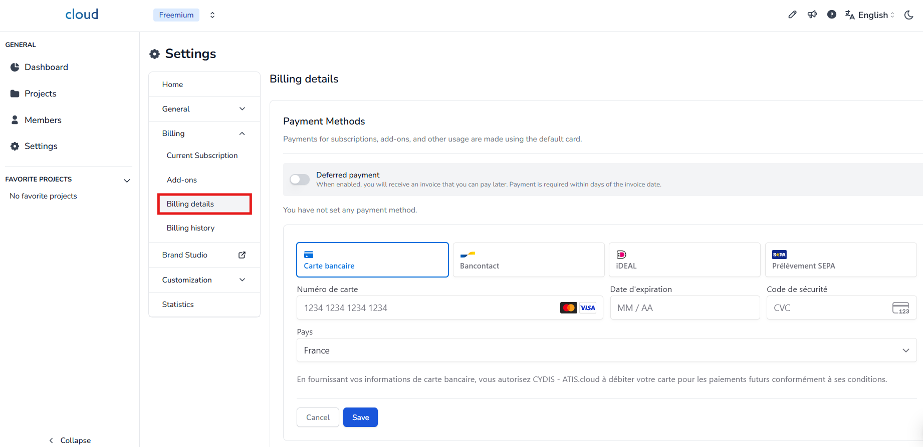 تتم جميع الإجراءات المذكورة أدناه من صفحة الفوترة، والتي يمكن الوصول إليها تحت علامة تبويب الإعدادات، إذا كان لديك الأذونات المطلوبة.