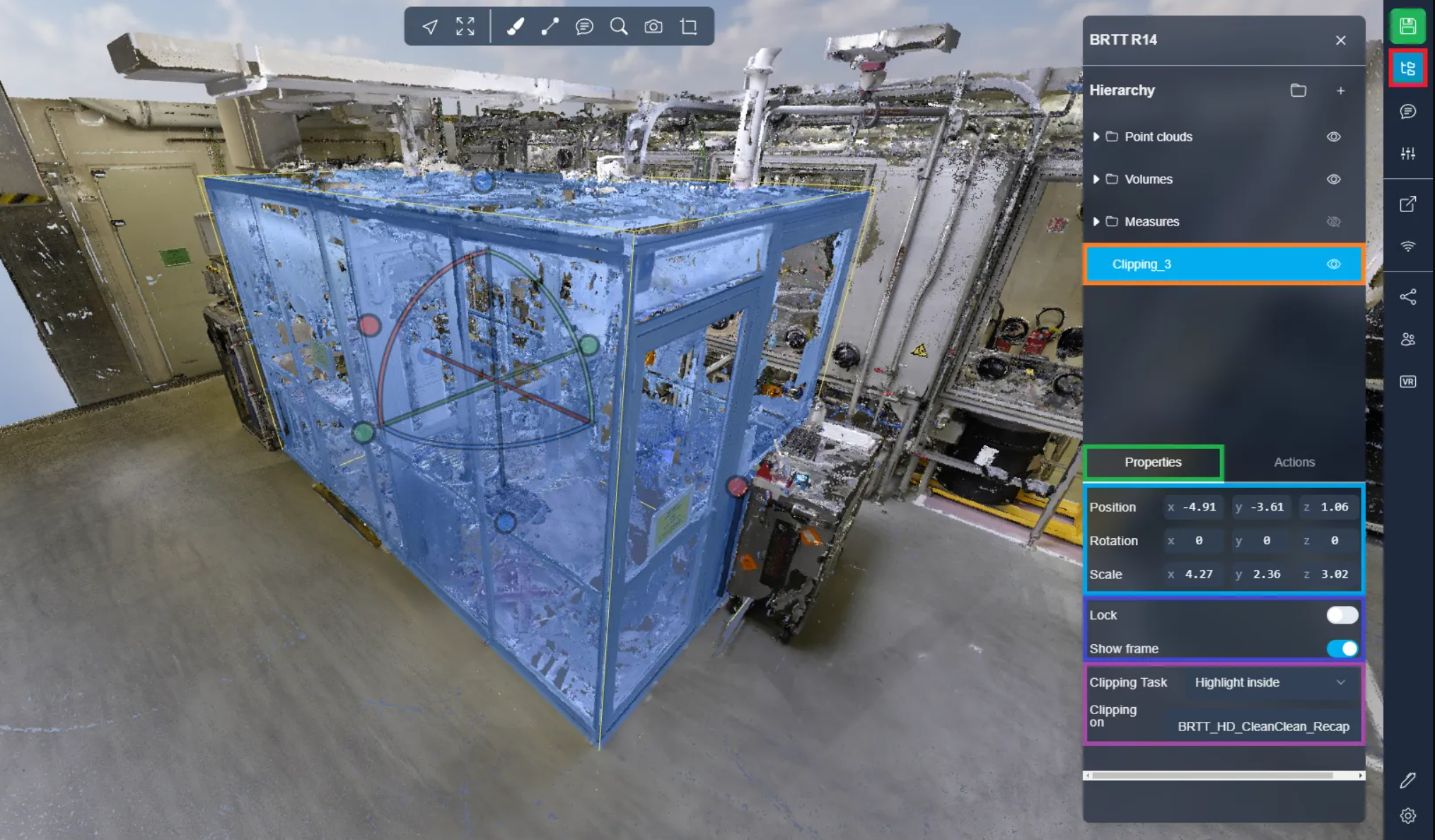 Finally, you have the option to change the clipping mode after placing a box. Here, you'll find the three modes discussed at the beginning of the article. Additionally, there's a list of all resources in the 3D Application, allowing you to choose which are affected by the box and which are not. This provides the flexibility to cut only your model, only your point cloud, or both, depending on your preferences.