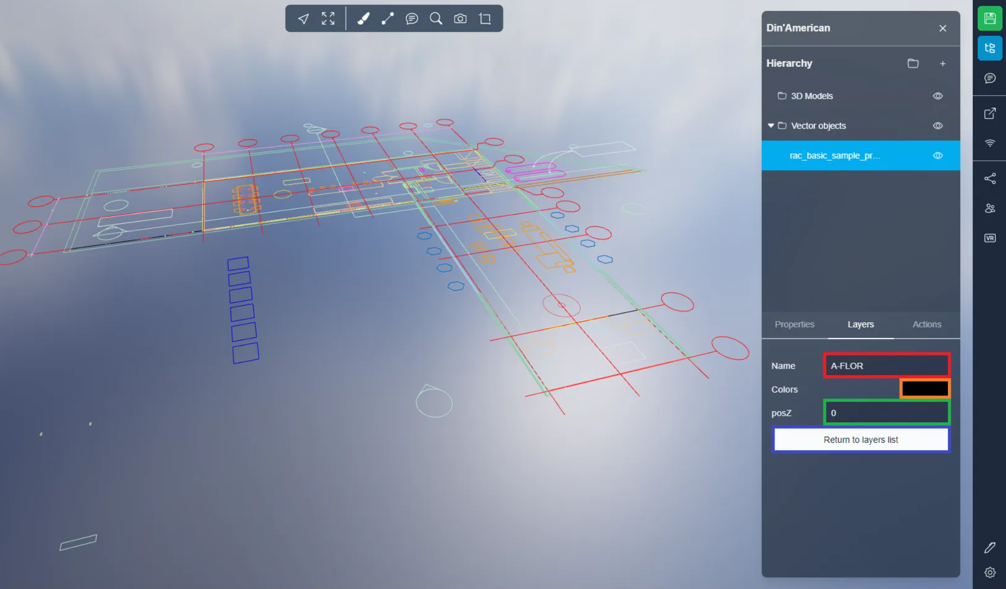 In the layer settings menu, you'll come across options to change the layer's name, adjust its color, and manipulate its position along the vertical axis. To return to the main list of layers, simply click the designated button.