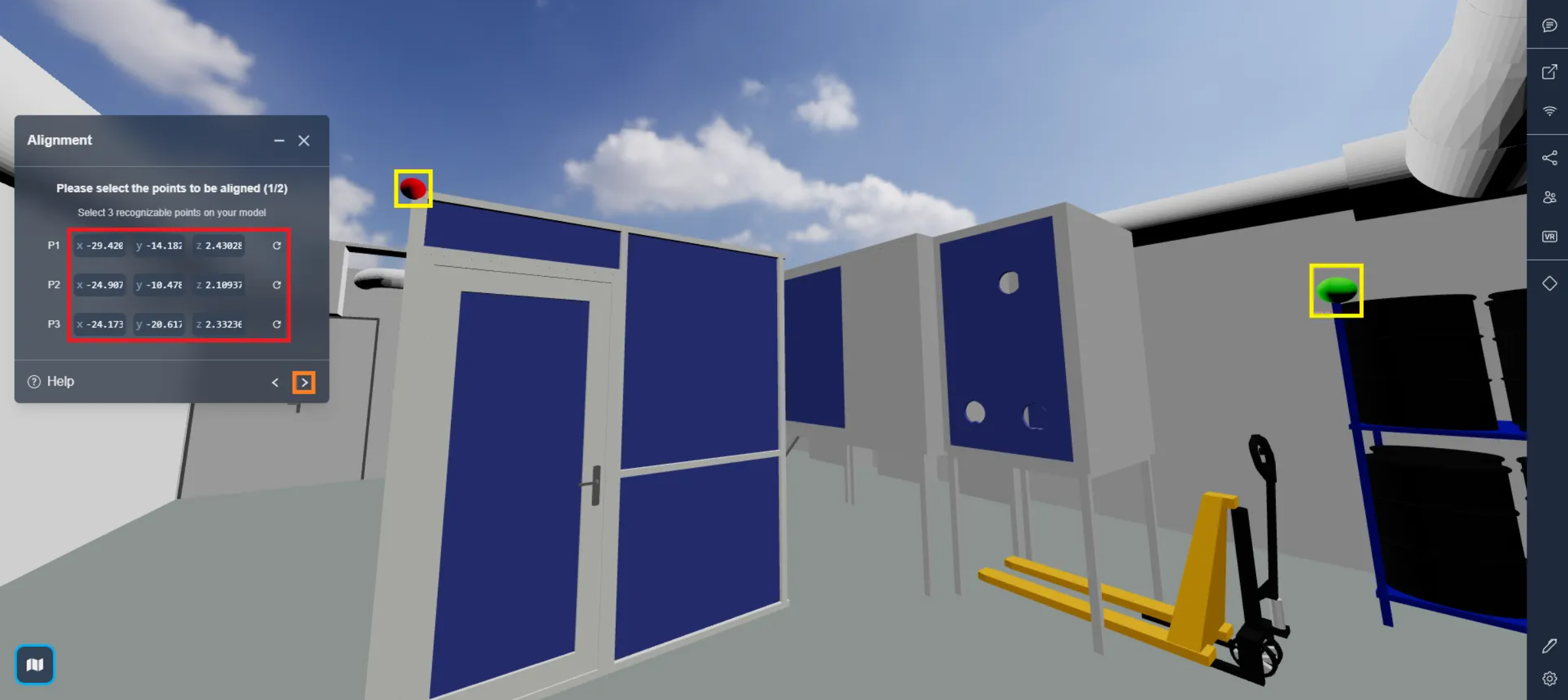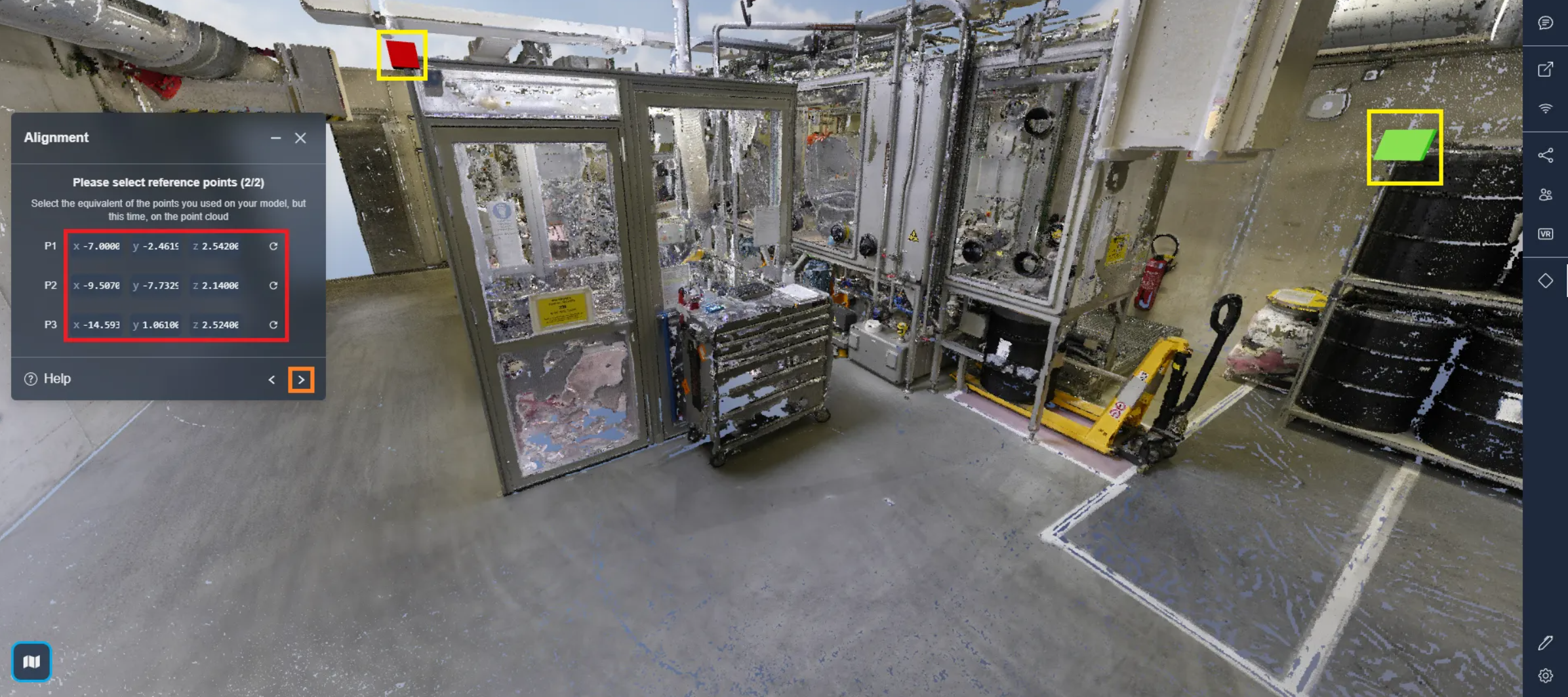 Remember to drop the squares in the same places as on the template and match the colors, the green dot on the template is at the top of the barrel stand, so the green rectangle should also be at the top of the barrel stand on the point cloud.