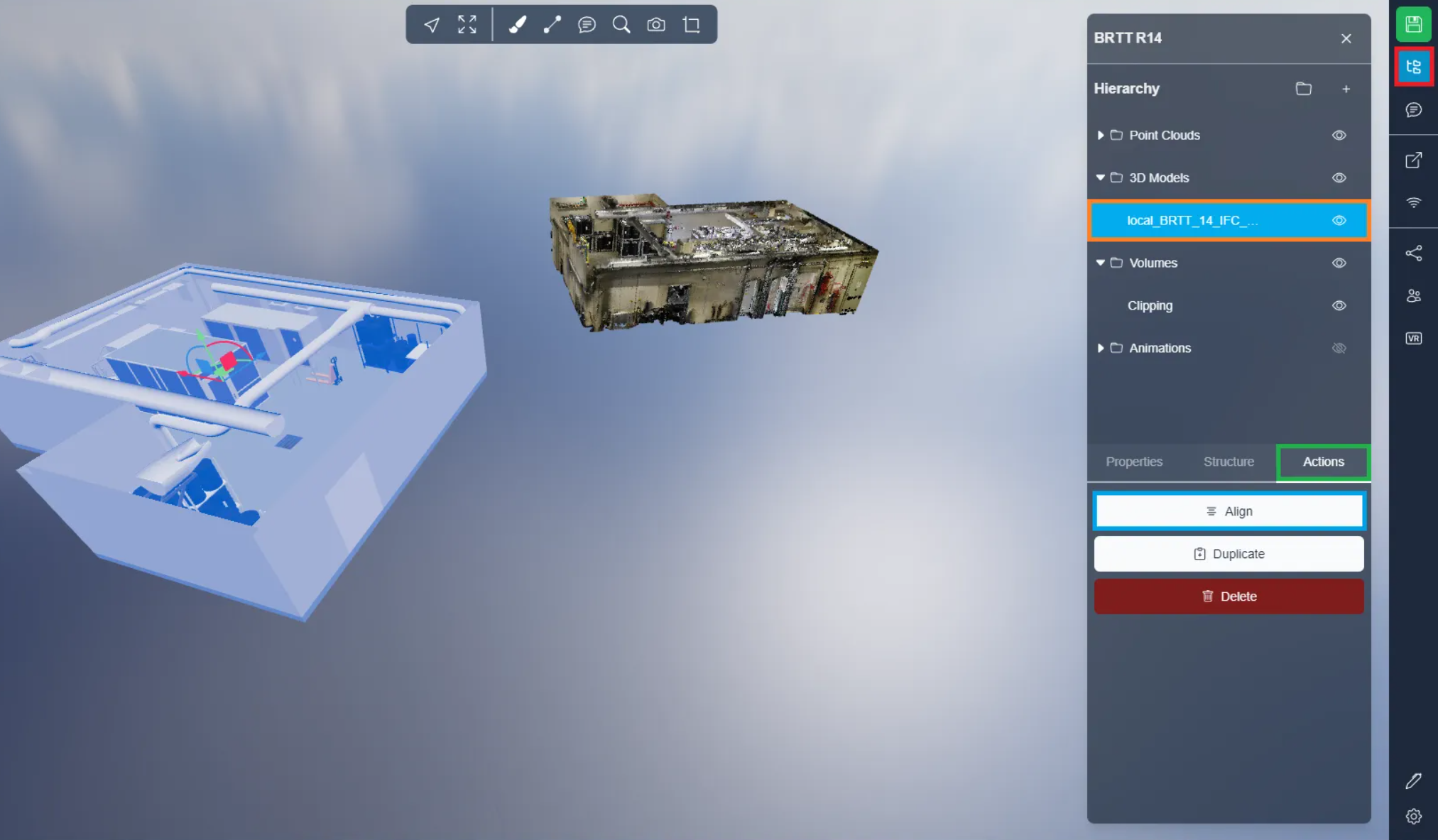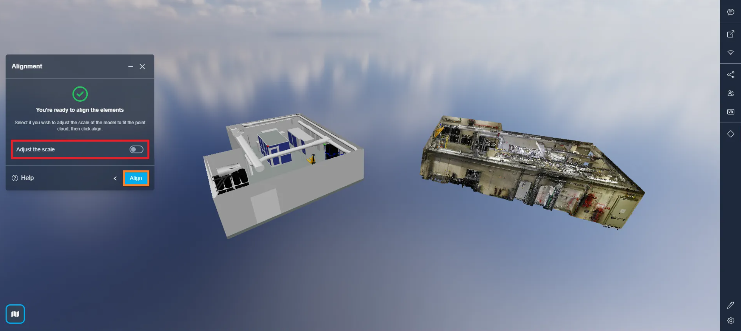 Once everything is set up, click Align to align the model with the point cloud, you can Adjust Scale to make sure the model fits the point cloud perfectly, we recommend using this option only if the model was not created with a correct scale, otherwise leave it as default.