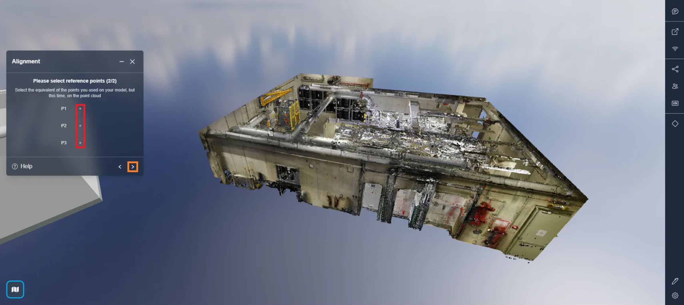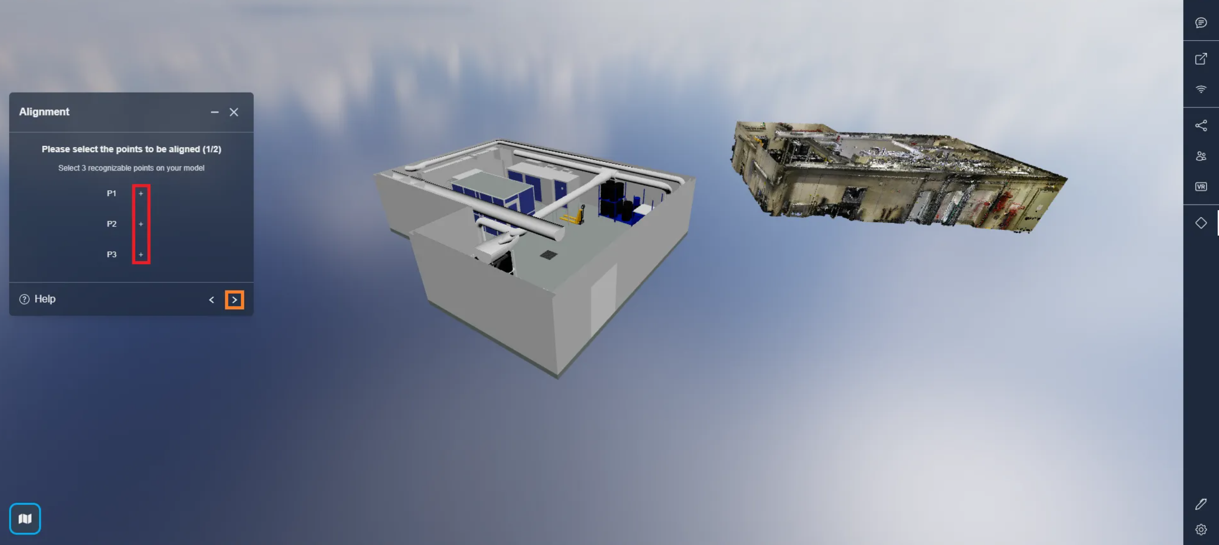First, click on one of the + icons to start placing your points. You will be asked to place 3 dots in recognizable locations on your model. In the next step, you will be asked to select the same places on the scatterplot, which is why they should be easily recognizable.