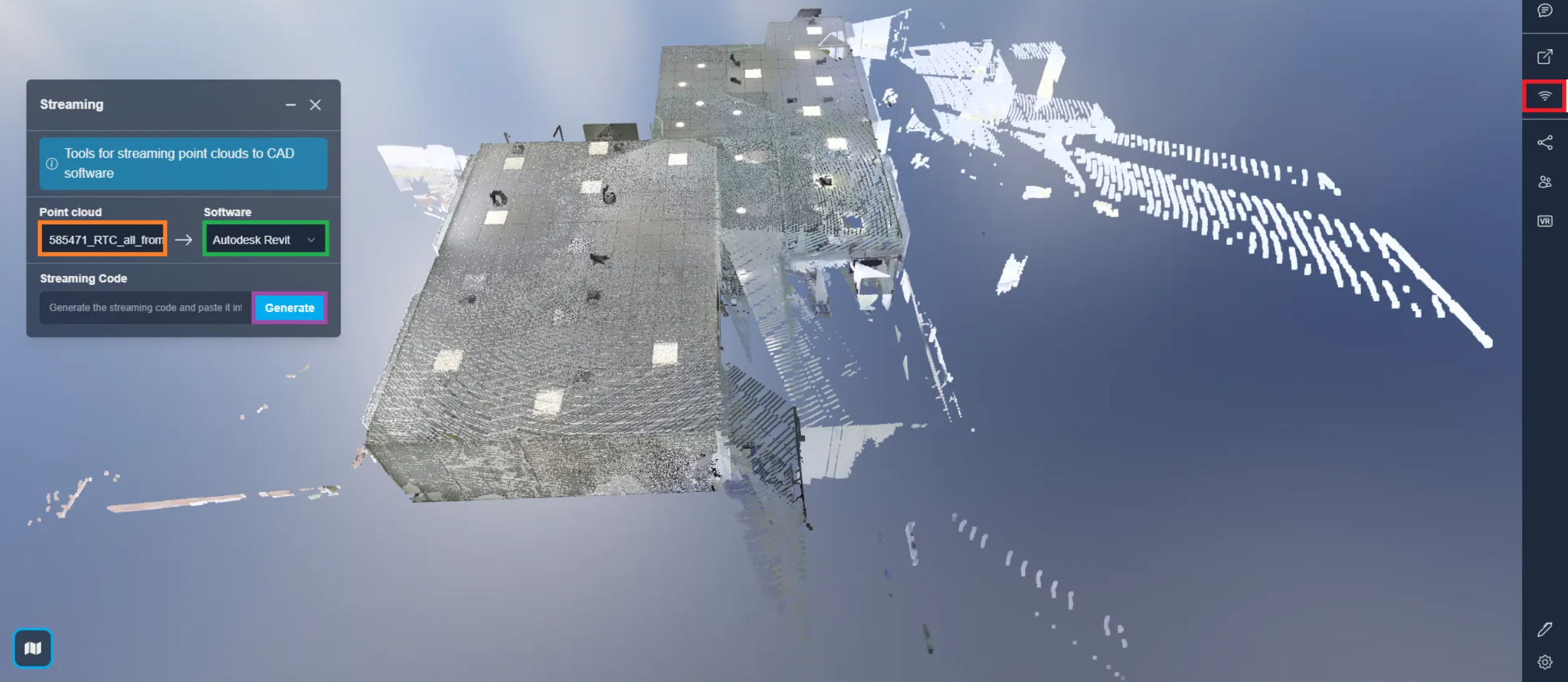 After opening a project, click on the streaming button, this will open the linked window. Then choose the cloud you want to use and verify that the selected software is Autodesk Revit then click Generate.