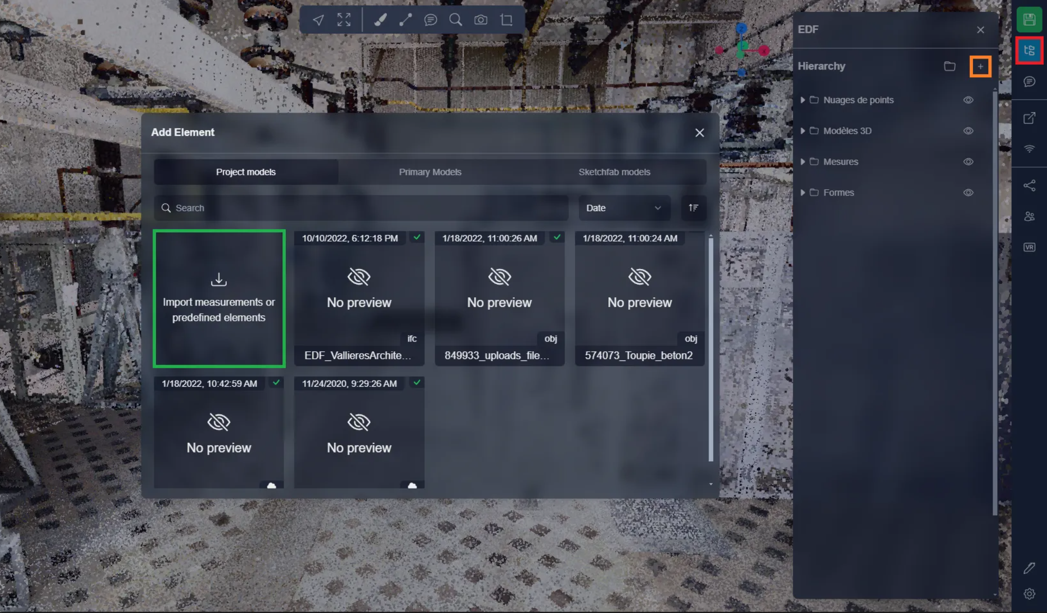 To begin, in the 3D Application, open the project menu and click on the + button. Here you will find an area to import measurements or primary elements. Click on it to open the importation page.