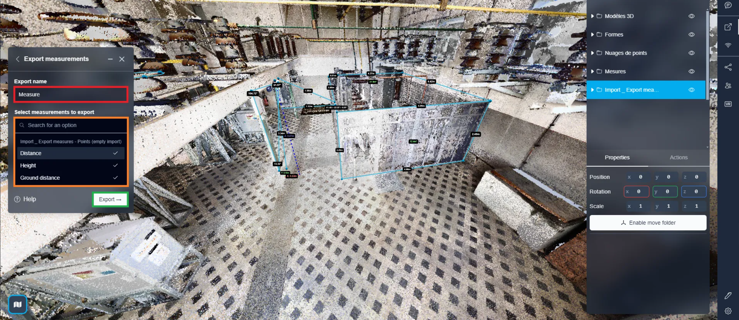 After entering a name for your CSV file, you can proceed to select the measurements you want to export. Simply click on a folder to choose all the measures contained within it. Once satisfied with your selection, click on “Export”. This action will initiate the download of two CSV files: one labeled “Export name (Project name) - points” and the other “Export name (Project name) - measurements”.