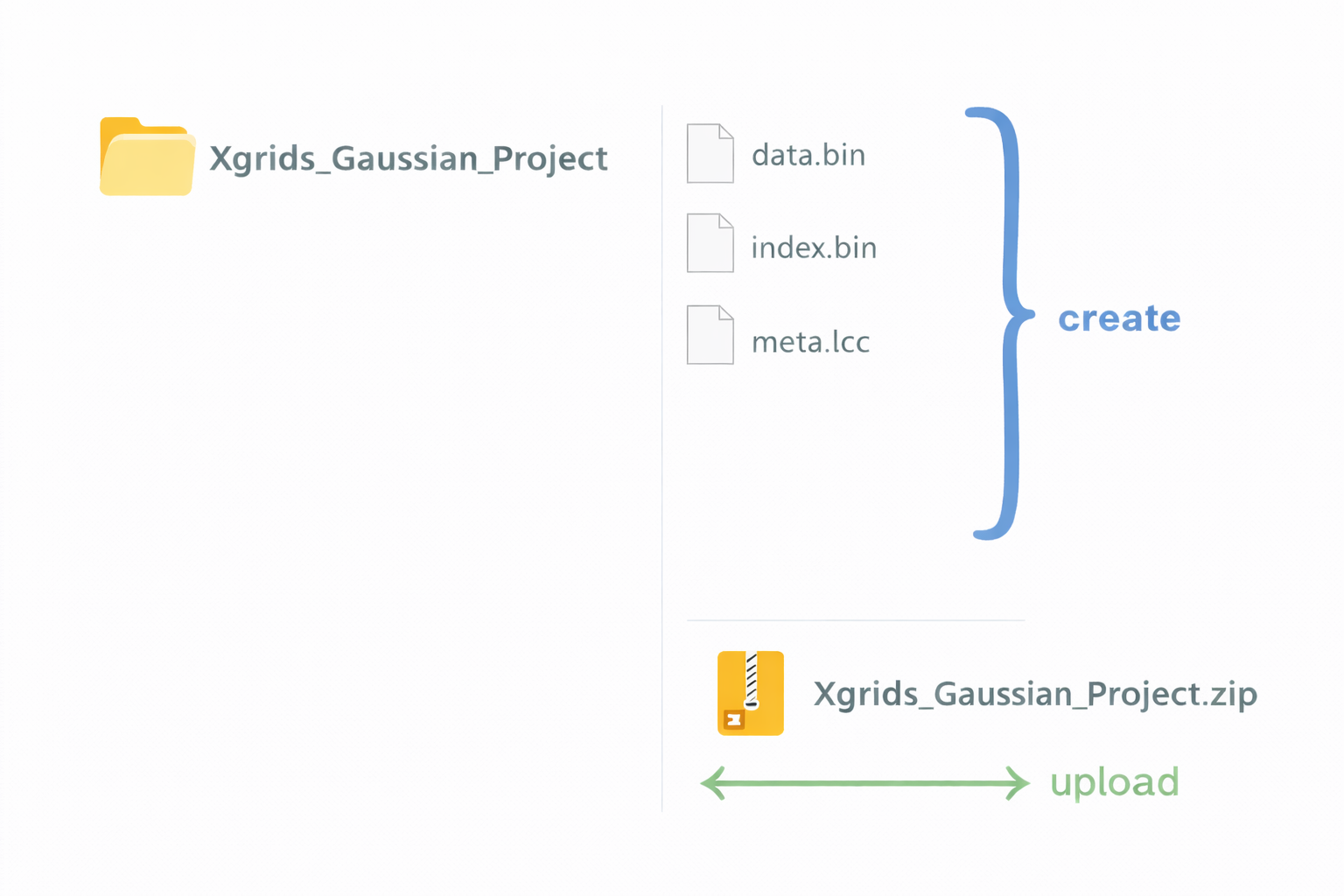To import an XGRIDS Gaussian Splatting project, you must first prepare the required project files and upload them in the correct structure