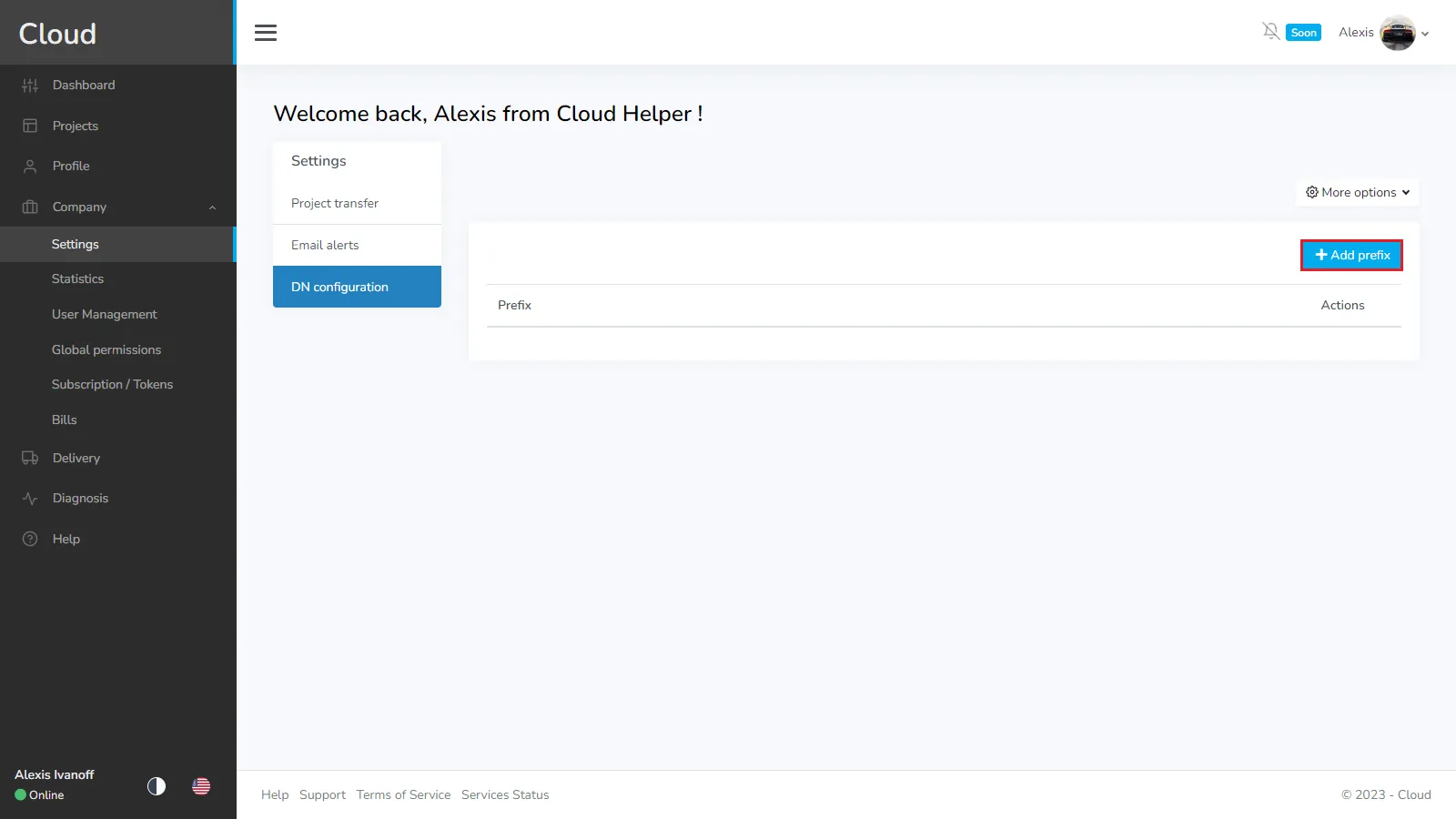 Access the Company Settings page, then select the DN configuration tab. Click on the right menu and select the prefix option.