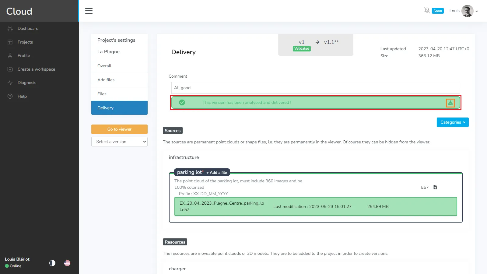 Then open the Delivery tab, this is where everything will happen on your side. When the project has not started yet, you will see all dropboxes empty. At the top of the page, you will always find the current version of the DN and the next version that will be created. Just like a regular project, you will find sources and resources, with other files in a separate zone in this case. In each of these zones you will find dropboxes sorted by category. To add a file in a dropzone either click the button and find the file on your computer or directly drag and drop the file on the dropbox. In the dropbox you will see the description, helping you understand what the project owners want you to put here as well as the wanted file's format, here we are awaiting an e57. In some cases you will also see what prefix is required for the files dropped here, in this case we can see the prefix is XX-DD\_MM\_YYY-. Any file that do not meet these requirements (Extension and Prefix will be rejected immediately)