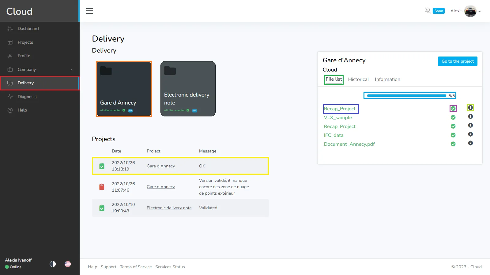 The DN summary page is accessible to all company managers that currently have DN projects ongoing (receiver side only). On it, you will find all of your projects that are currently in DN mode. Click one to load its information. Below you will find all the latest information about all of your projects. On the right you will find all the information regarding the selected project. In the file list tab you will find all the files in the project, how many of those have been validated out of the total and for each file its name along with its state and an information icon.