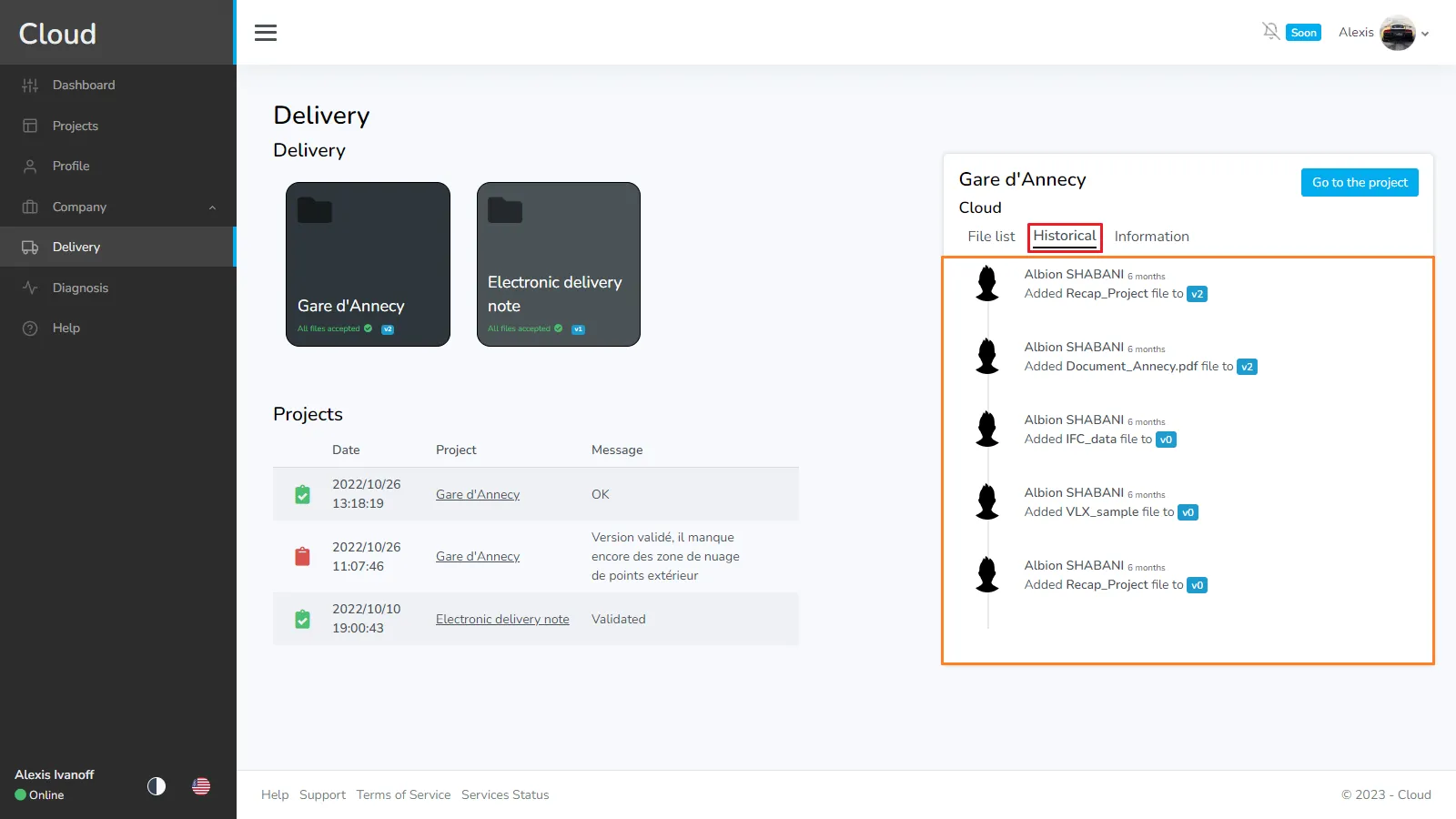 Finally, the Information tab will offer you an overview of who participated in the project, whether they were on the delivery or receiver side, when the project was created and when it was updated as well as its current status.