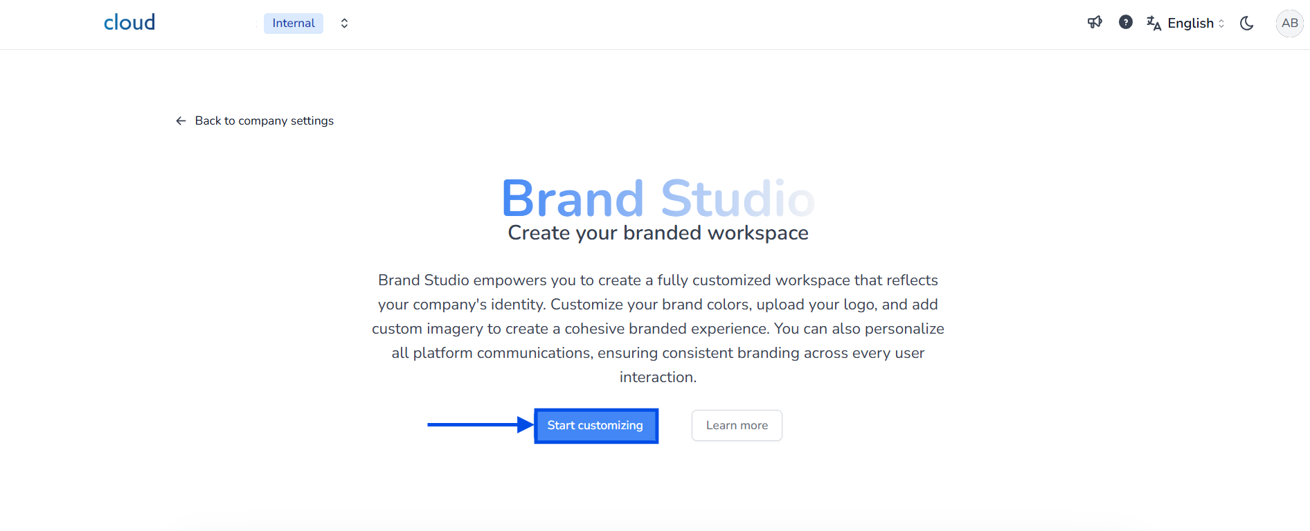 To begin customizing your interface, go to the Settings menu and open the Brand Studio section.