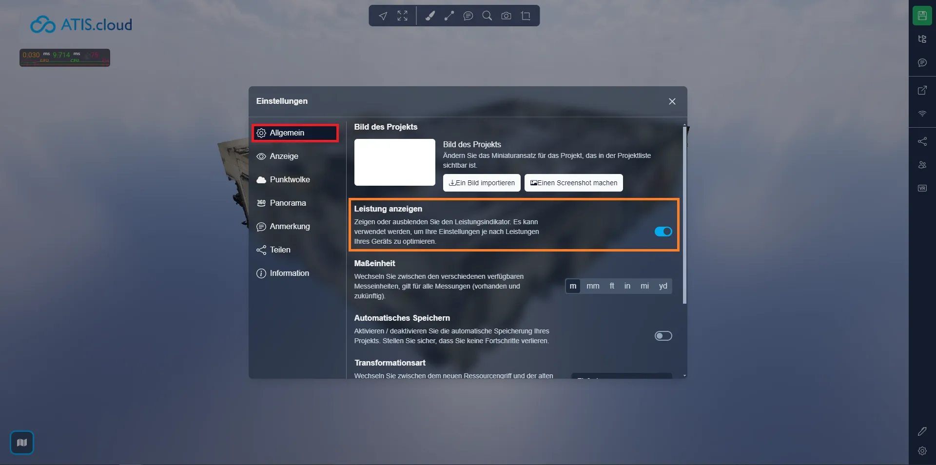 Es ist möglich, einen Leistungsindikator anzuzeigen. Auf diese Weise können Sie sehen, wie Ihr Gerät auf die Darstellung von 3D reagiert. Der Wert, der uns hier am wichtigsten ist, ist der FPS (Frames Per Second), dieser entspricht der Anzahl der Bilder, die pro Sekunde angezeigt werden.