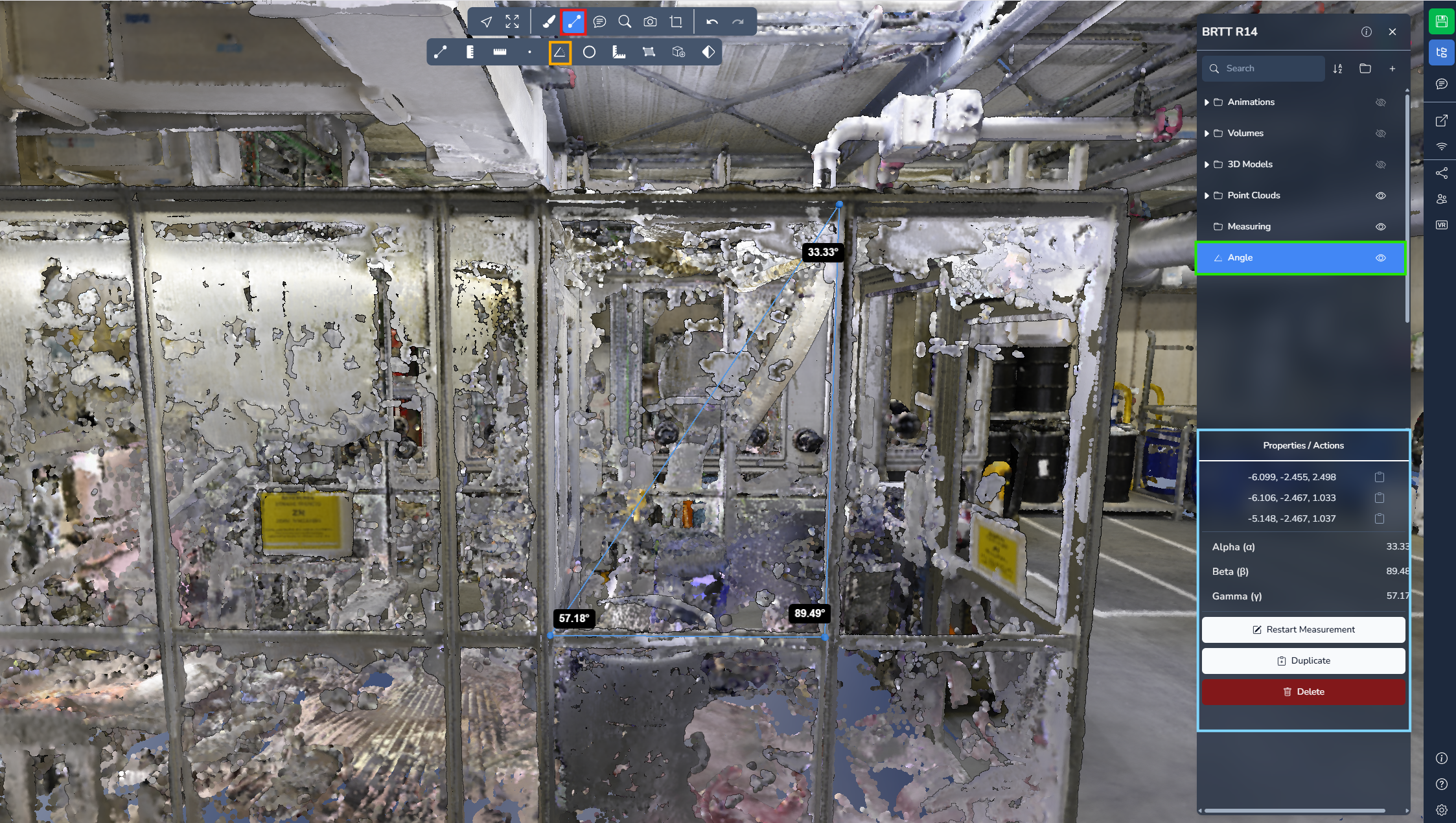 Die Winkel-Messung ermöglicht es Ihnen, ein Dreieck mit drei Punkten zu erstellen. Das System berechnet und zeigt anschließend den Winkelwert an jedem Punkt an.