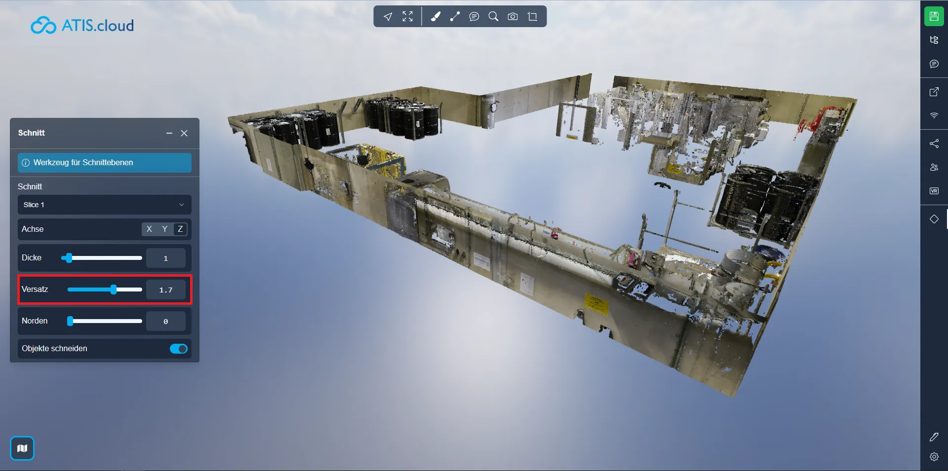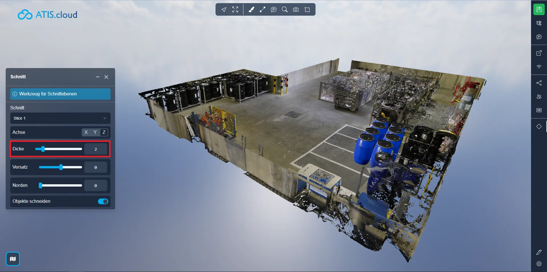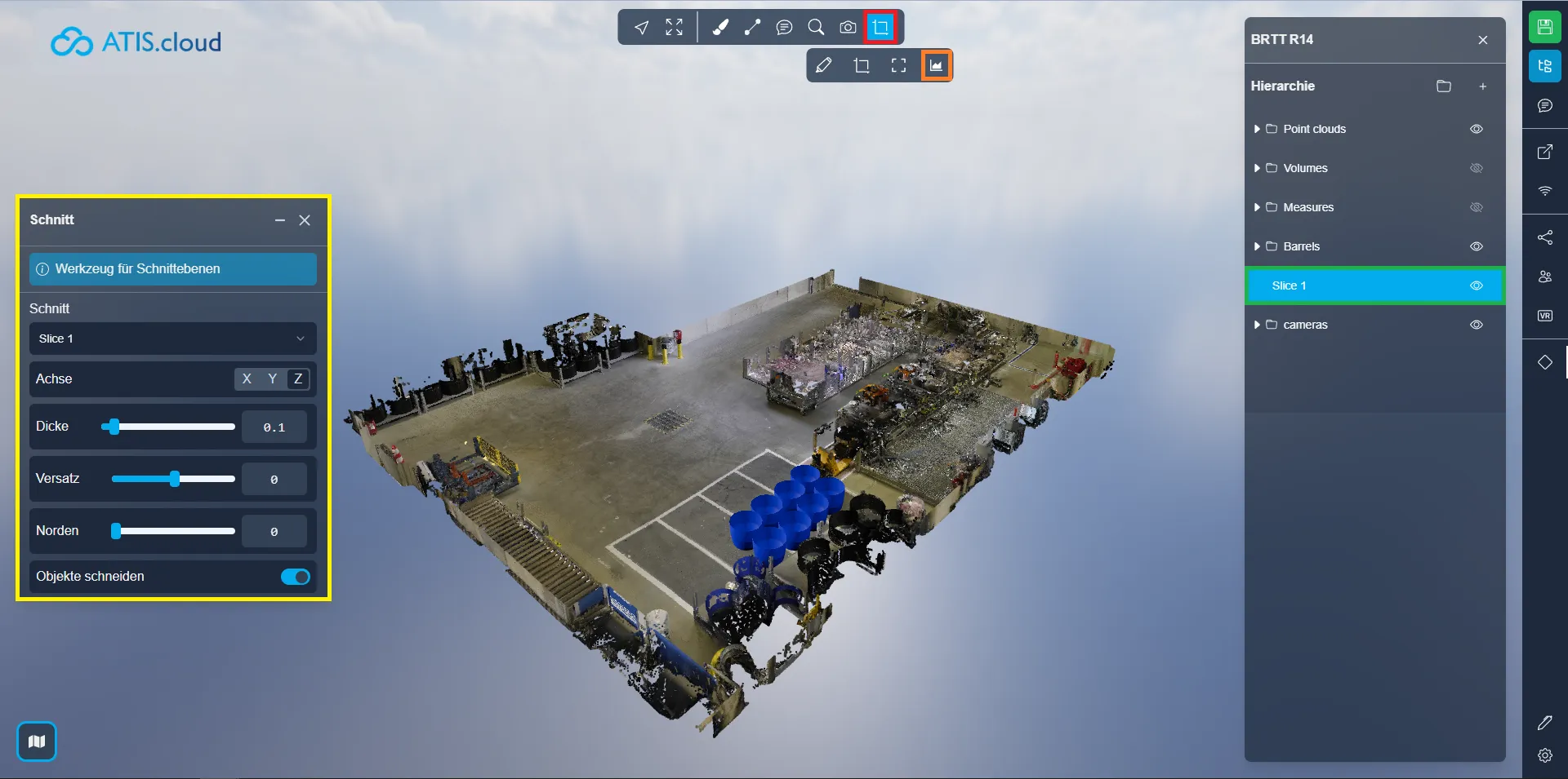 Mit dem Werkzeug „Schnittebene“ können Sie einen Ausschnitt einer Punktwolke als Scheibe anzeigen, die entweder horizontal oder vertikal sein kann. Sie haben die Kontrolle über Position und Dicke und können die Visualisierung entsprechend Ihren Anforderungen anpassen.
