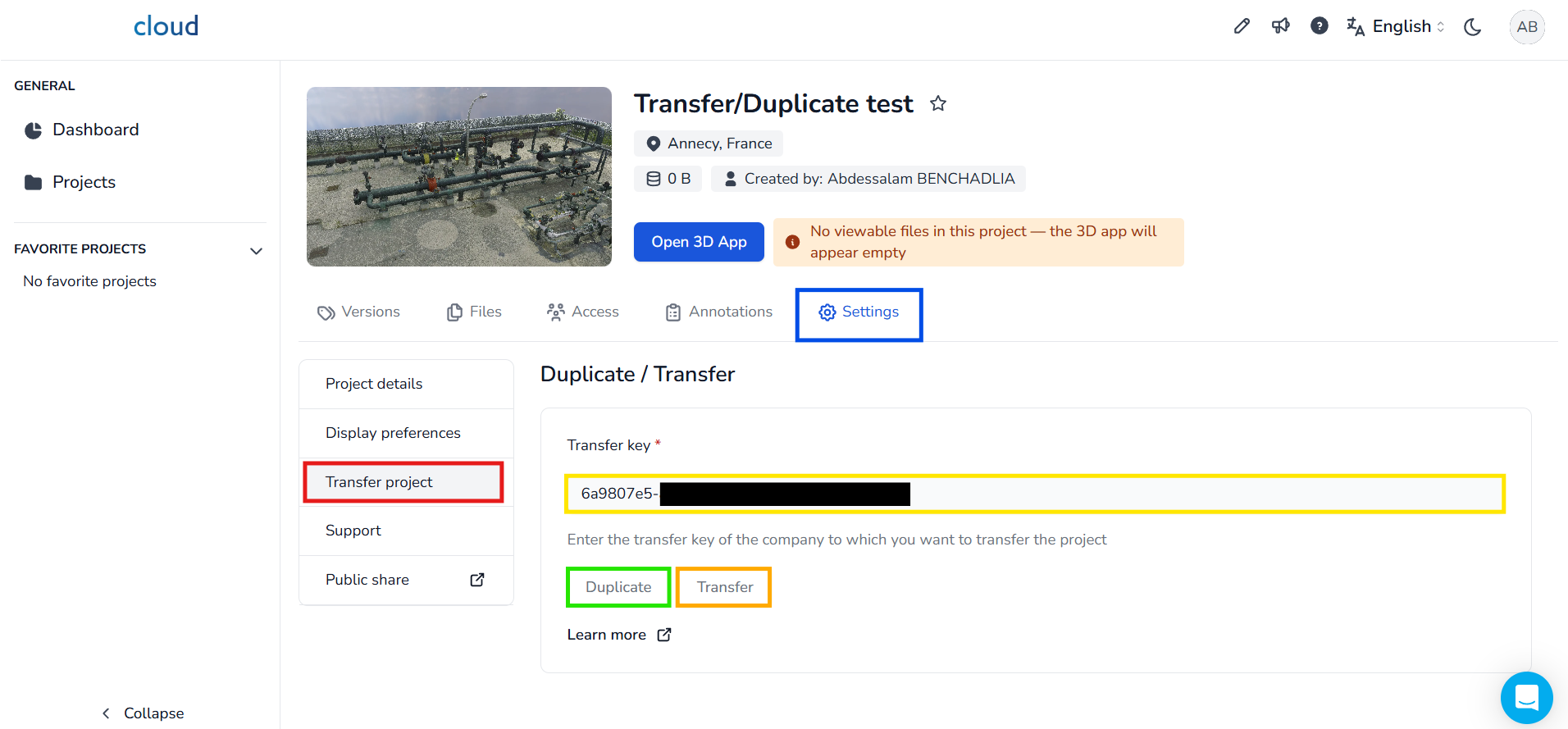 Öffnen Sie das Projekt, das Sie übertragen oder duplizieren möchten, gehen Sie dann zu Einstellungen und klicken Sie auf Projekt übertragen. Fügen Sie den zuvor kopierten Transfer-Schlüssel in das Feld Transfer-Schlüssel ein und wählen Sie dann, ob Sie das Projekt Duplizieren oder Übertragen möchten.