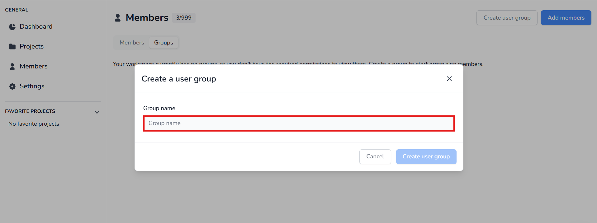 En tu espacio de trabajo, puedes crear grupos de usuarios y agregar miembros a ellos para construir una mejor estructura y simplificar la gestión de permisos de usuario en los proyectos.