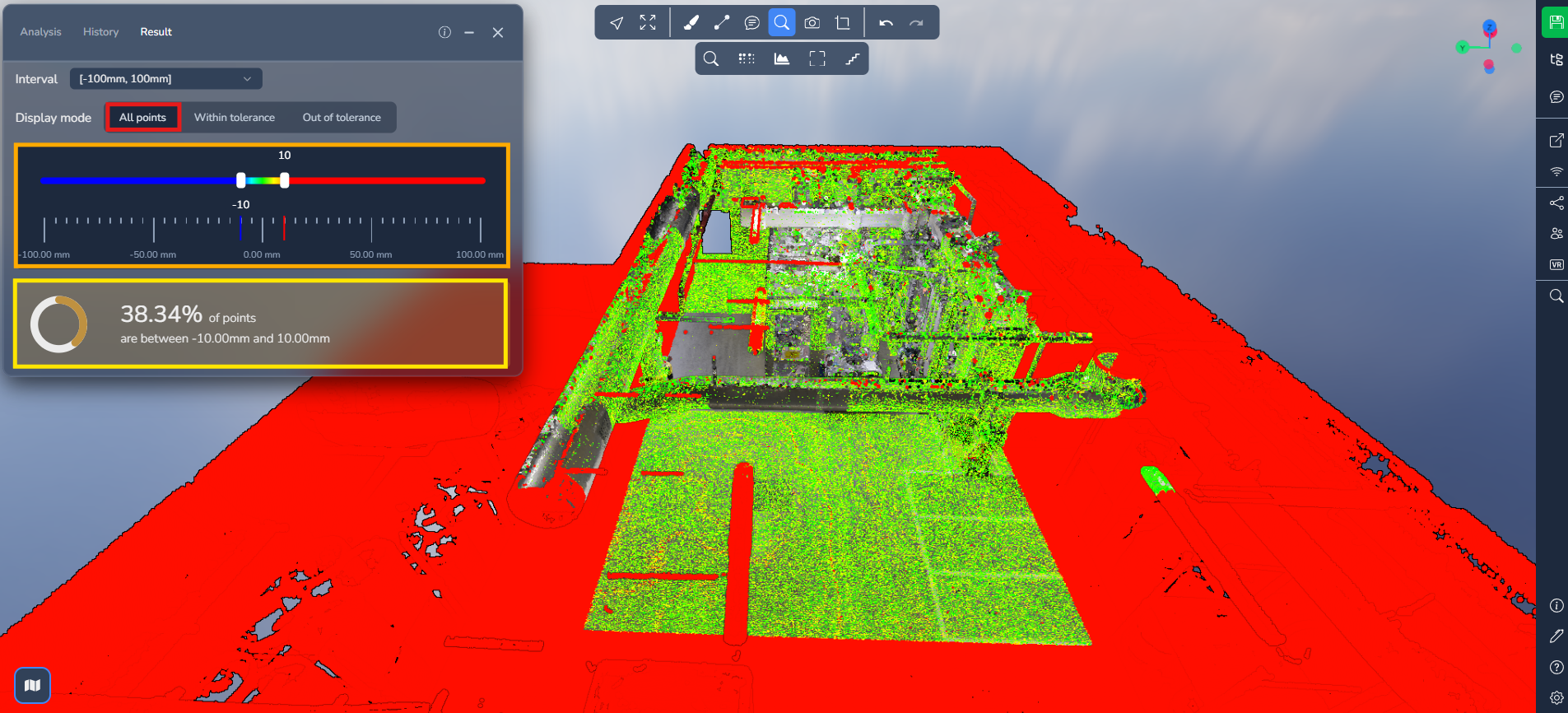 En el segundo modo, Dentro de la tolerancia solo se muestran las porciones de la nube de puntos que se encuentran dentro del rango de tolerancia definido.
