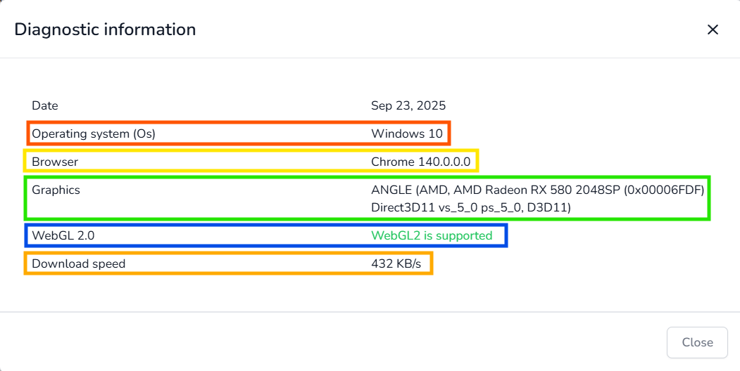 La sección Diagnóstico te permite verificar si tu dispositivo, navegador y red cumplen con los requisitos técnicos para navegar adecuadamente en la Aplicación 3D.