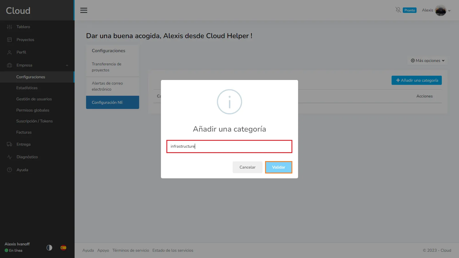 En la entrada, puede ingresar el nombre de su categoría, luego haga clic en validar para guardarlo.