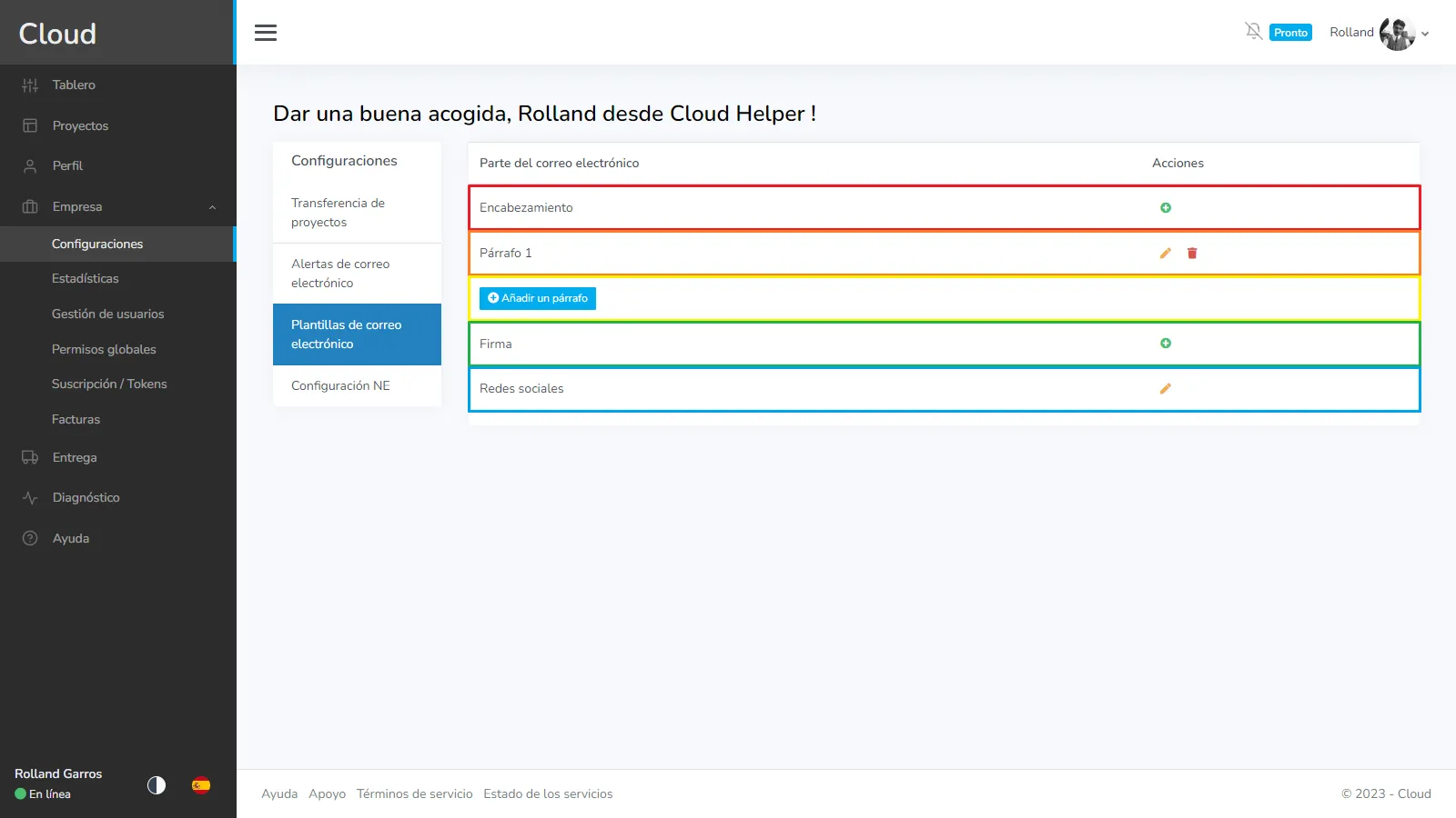 Aquí tenemos todas las categorías que se han completado antes, también notará una línea que no está contenida en ningún cuadro, ahí es donde estará el contenido del correo electrónico cuando se envíen correos electrónicos.