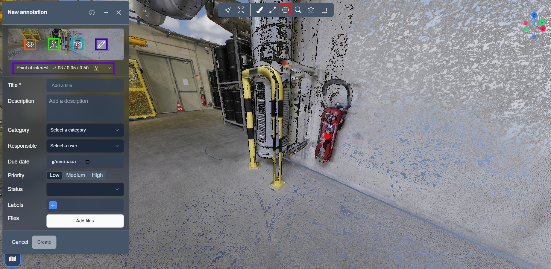 Vous pouvez entrer un titre et une description, sélectionner une catégorie, la catégorie déterminera la couleur du cône et du point dans l'application 3D, vous permettant de trouver des annotations connexes plus rapidement.