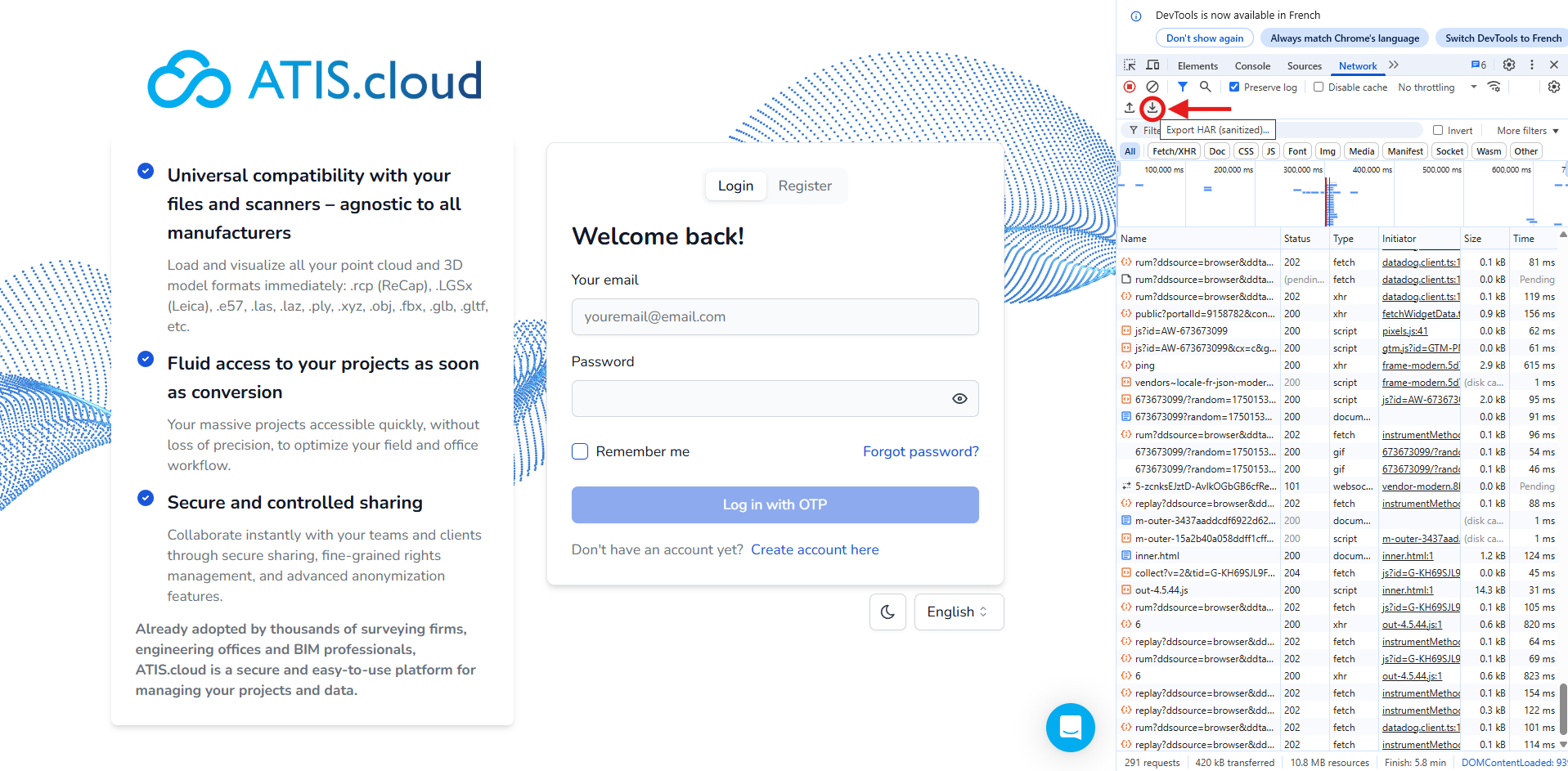 Si vous rencontrez des problèmes pour accéder à ATIS.cloud ou si vous remarquez que certaines fonctionnalités ne fonctionnent pas correctement (chargement de projet, problèmes d'authentification, lenteur, etc.), notre équipe de support peut vous demander de fournir un fichier HAR.