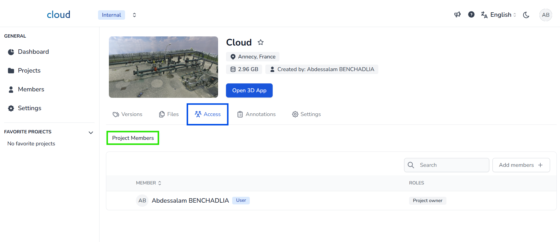 - Sur la page de détails du projet, allez à l'onglet Accès. Cette section comprend deux sous-sections : Membres du projet et Partage public. Assurez-vous d'être dans la section Membres du projet.