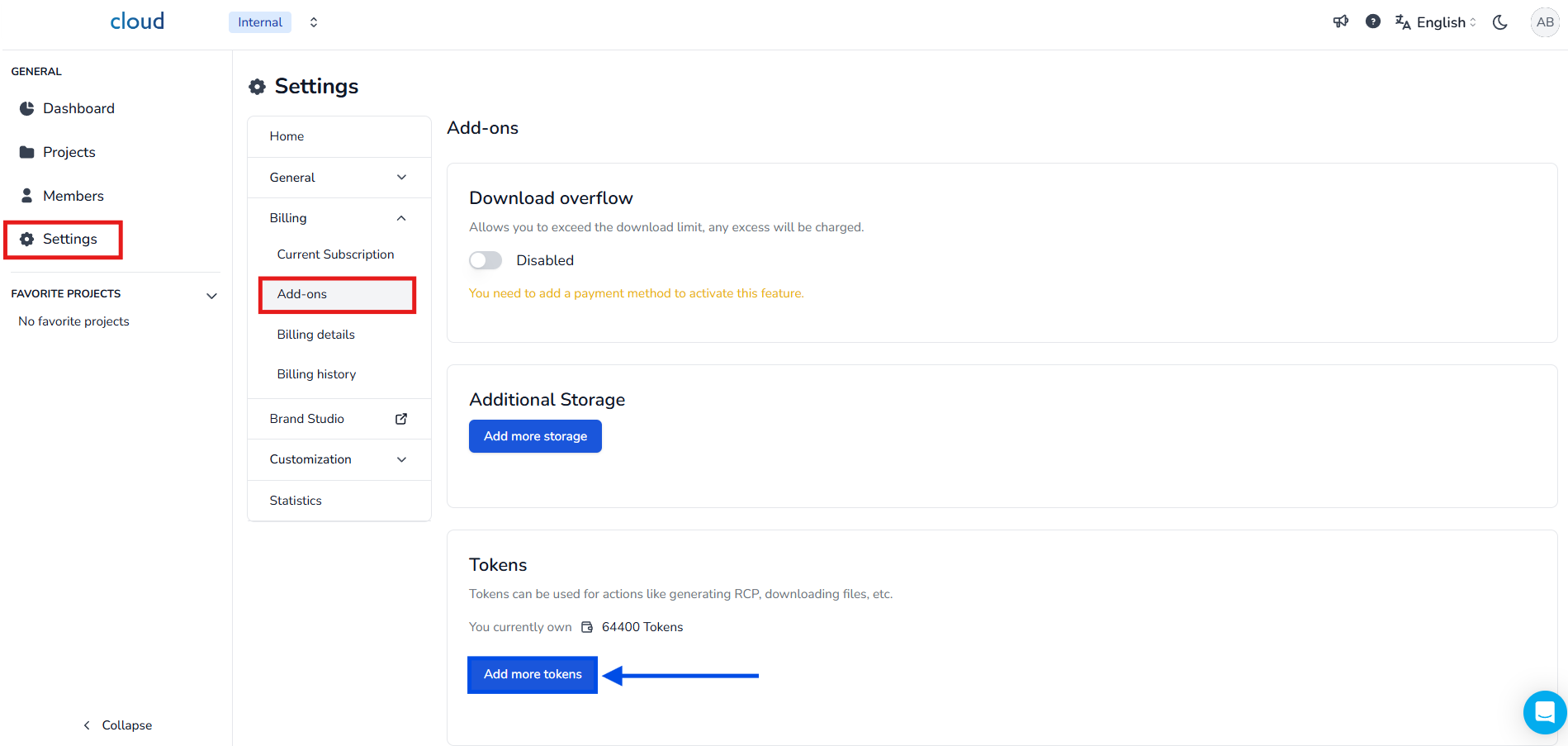 כדי לרכוש טוקנים בפלטפורמה, עבור לעמוד ה- Settings → Billing → הסקשן Add-ons.