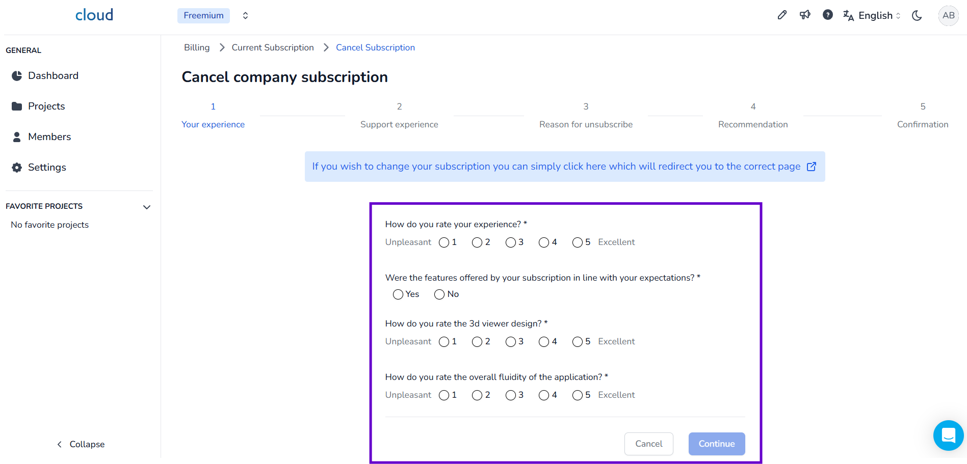 זה יפתח עמוד עם טופס, מלא את הטופס כדי לבטל את המנוי. ביטול המנוי מהפלטפורמה יחזיר אותך להיות Freemium, הוא לא ימחק את החשבון שלך, כך שתוכל תמיד לחזור ולהתחיל מנוי מחדש whenever you need it!