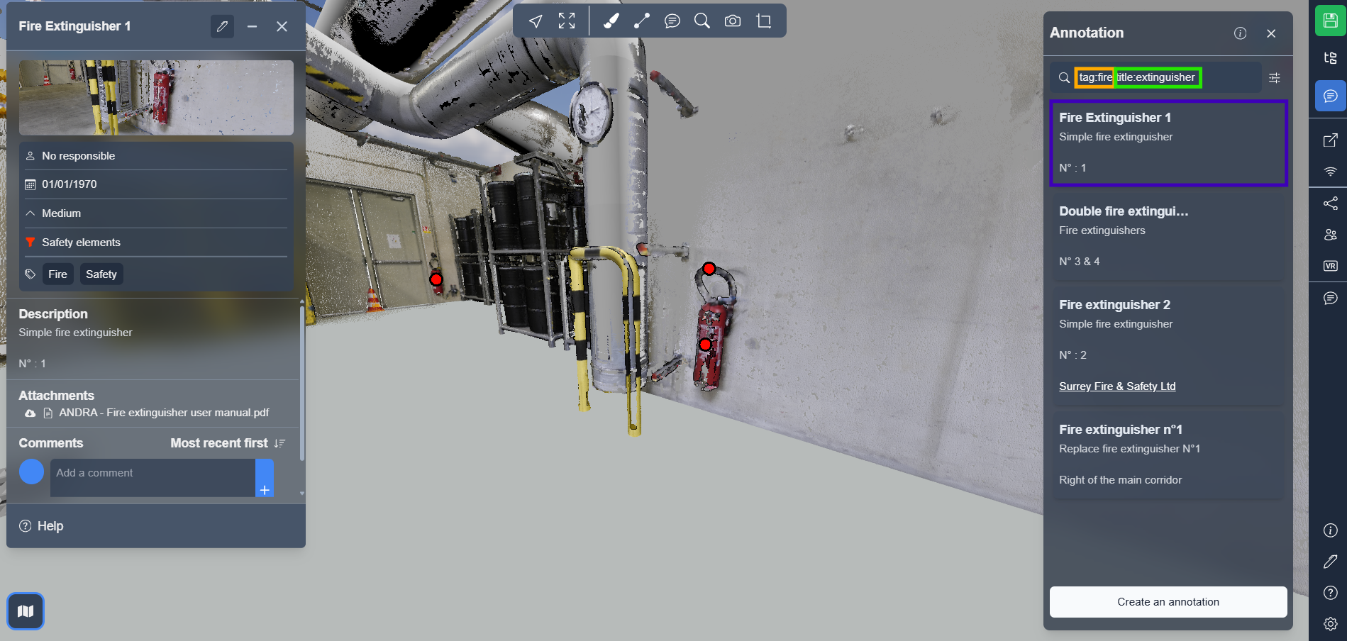 उन annotations को प्रदर्शित करता है जिनके पास टैग fire और शीर्षक में शब्द extinguisher है.
