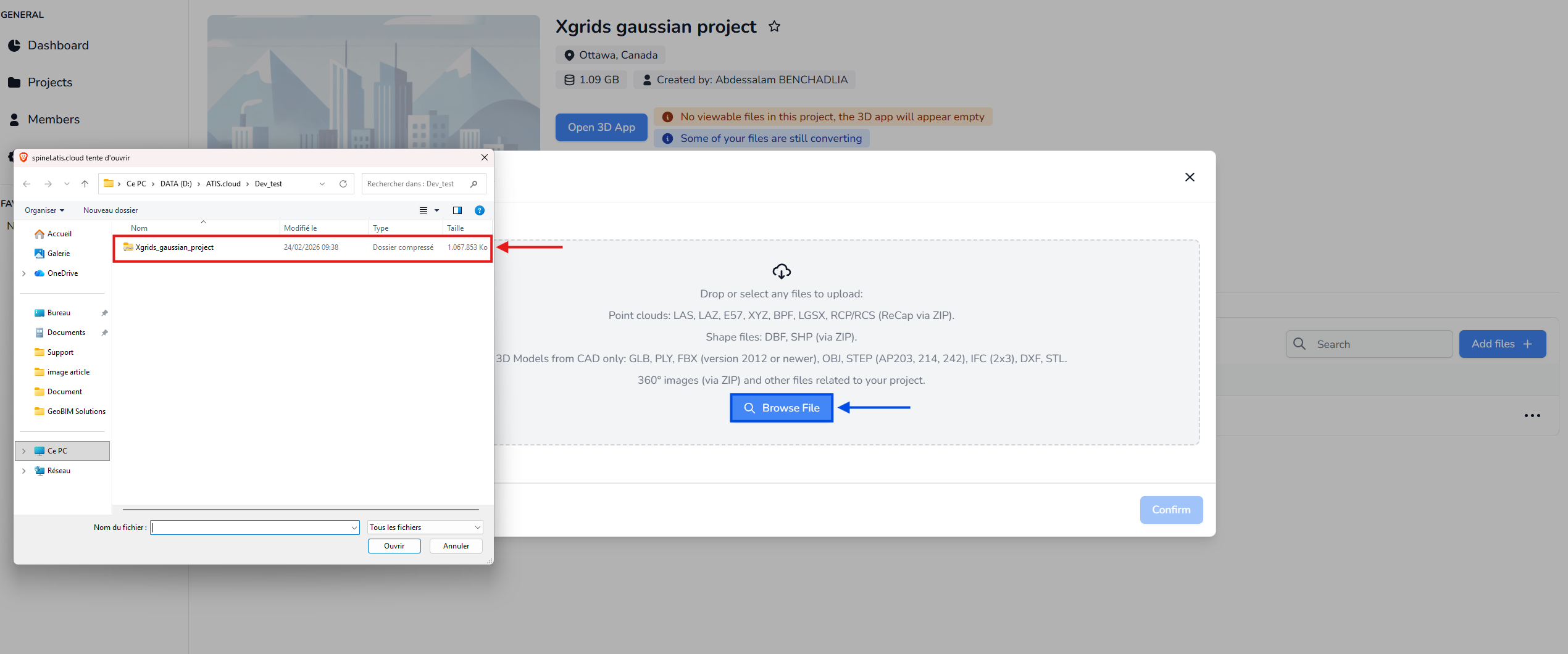 फ़ाइल चुनने के बाद, अपलोड की पुष्टि करें। यदि ZIP संरचना सही है, तो प्लेटफार्म स्वतः GRIDS LCC प्रारूप का पता लगा लेगा और रूपांतरण प्रक्रिया शुरू कर देगा। किसी मैनुअल फ़ॉर्मेट चयन की आवश्यकता नहीं है।