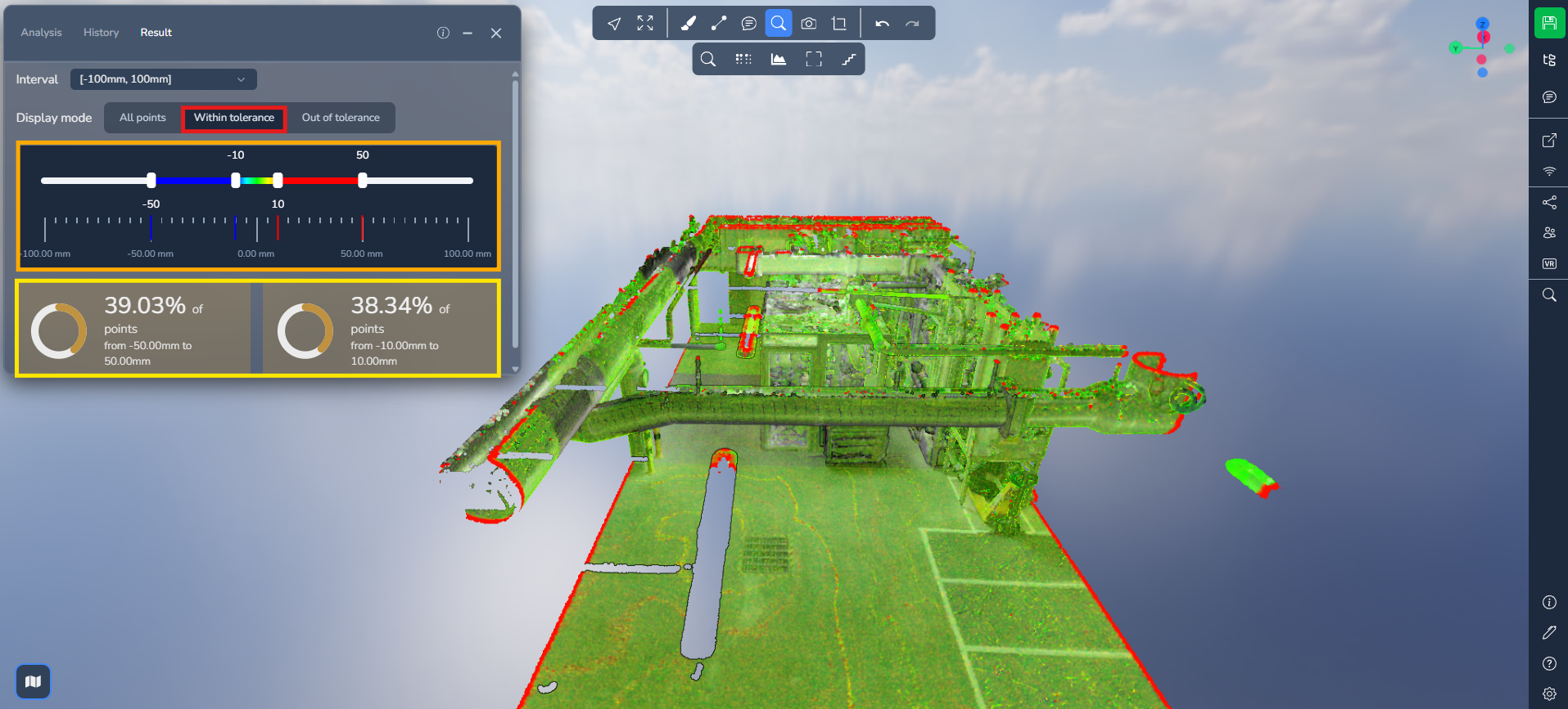 अंतिम मोड में, सहनशीलता के बाहर केवल वे क्षेत्र दिखते हैं जहाँ विसंगतियाँ परिभाषित सहनशीलता से अधिक हैं।