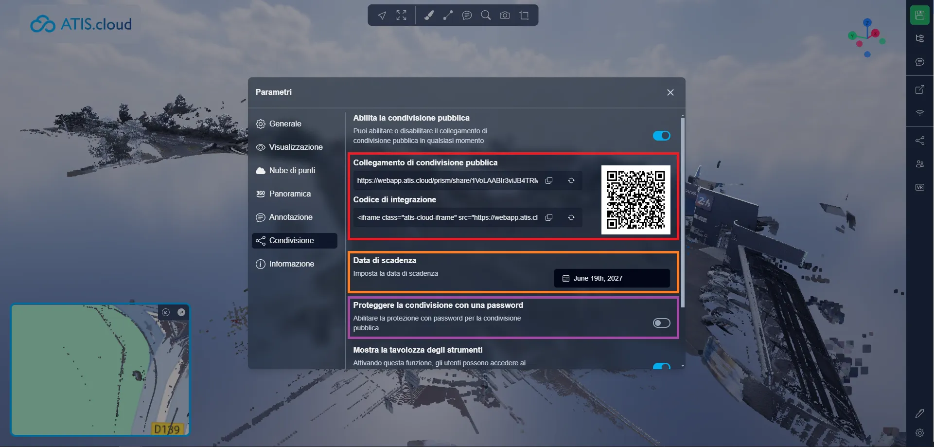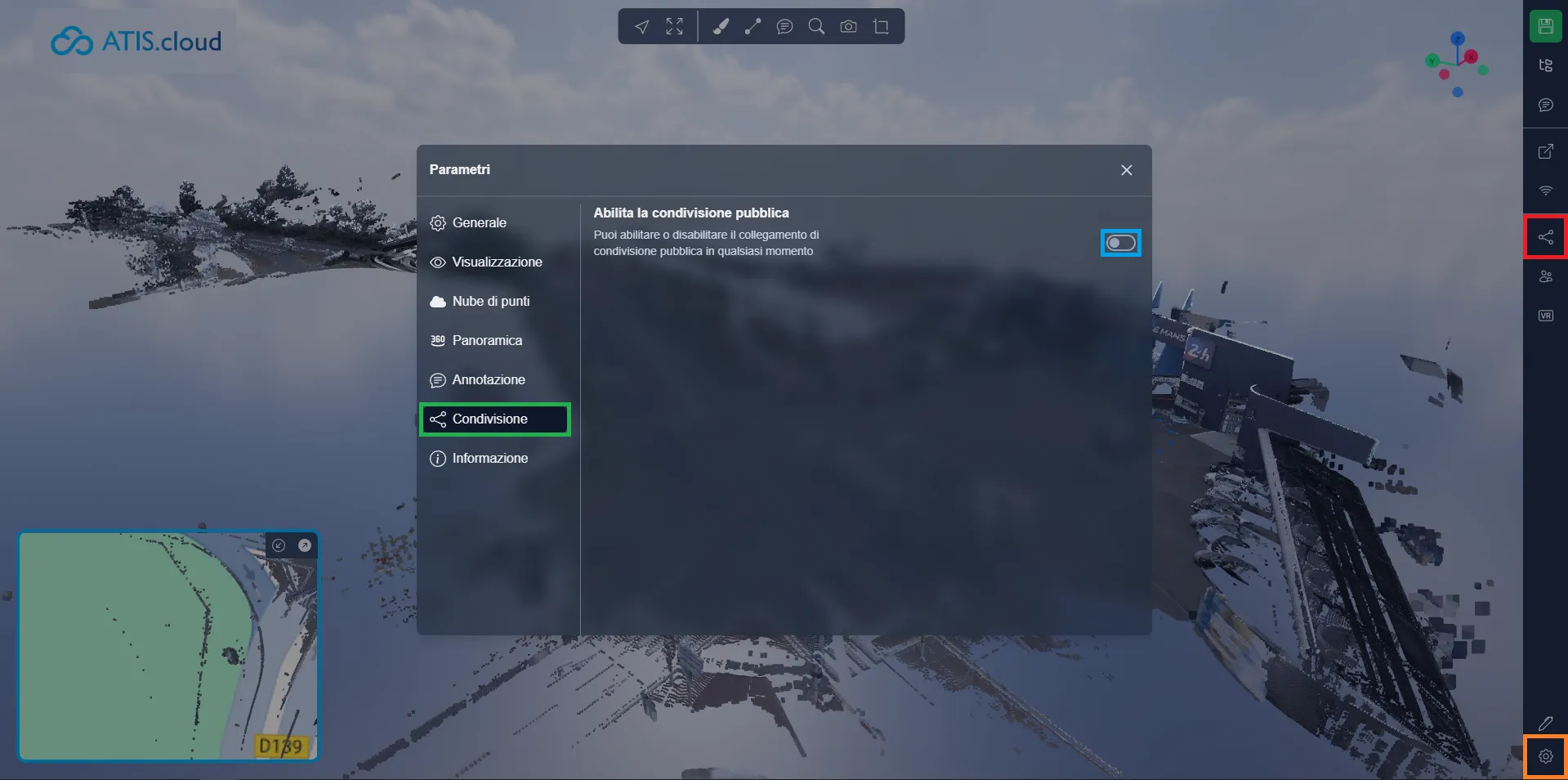 Con la versione 4 dell'applicazione, puoi abilitare/disabilitare la condivisione pubblica direttamente dall'Applicazione 3D. L'interfaccia è simile a quella che puoi trovare in questo articolo.