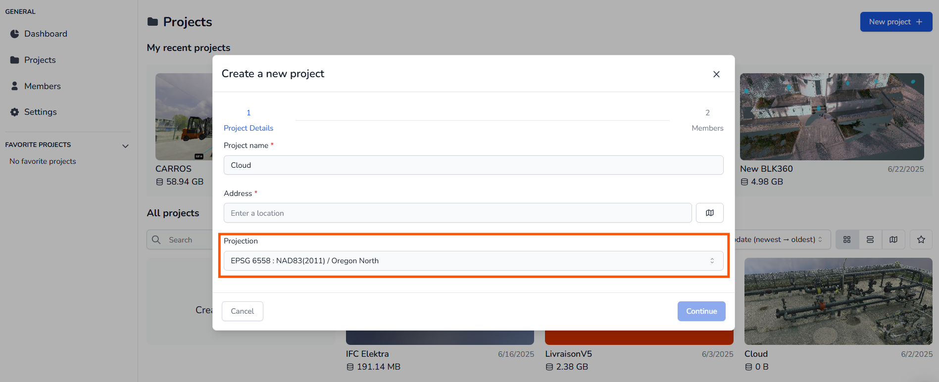 Nota che puoi anche configurarla o modificarla nella pagina di edizione del progetto, per farlo, vai alla scheda Impostazioni del tuo progetto, poi clicca su Dettagli del progetto. Scorri fino alla sezione Proiezione, clicca sul menu a discesa e seleziona una nuova proiezione per sostituire quella esistente.