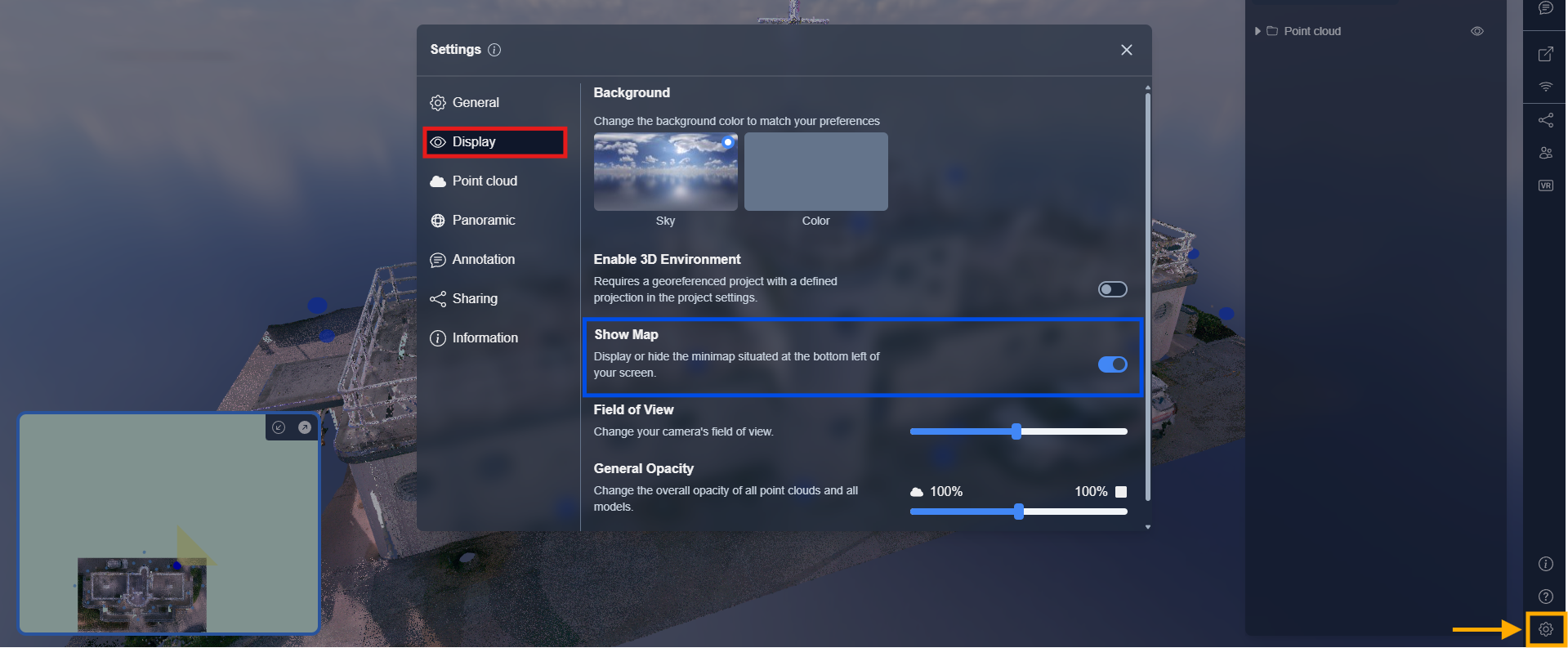 Una volta attivata, appare una minimappa nell'angolo in basso a sinistra, che mostra etichette dei piani cliccabili e punti di navigazione.