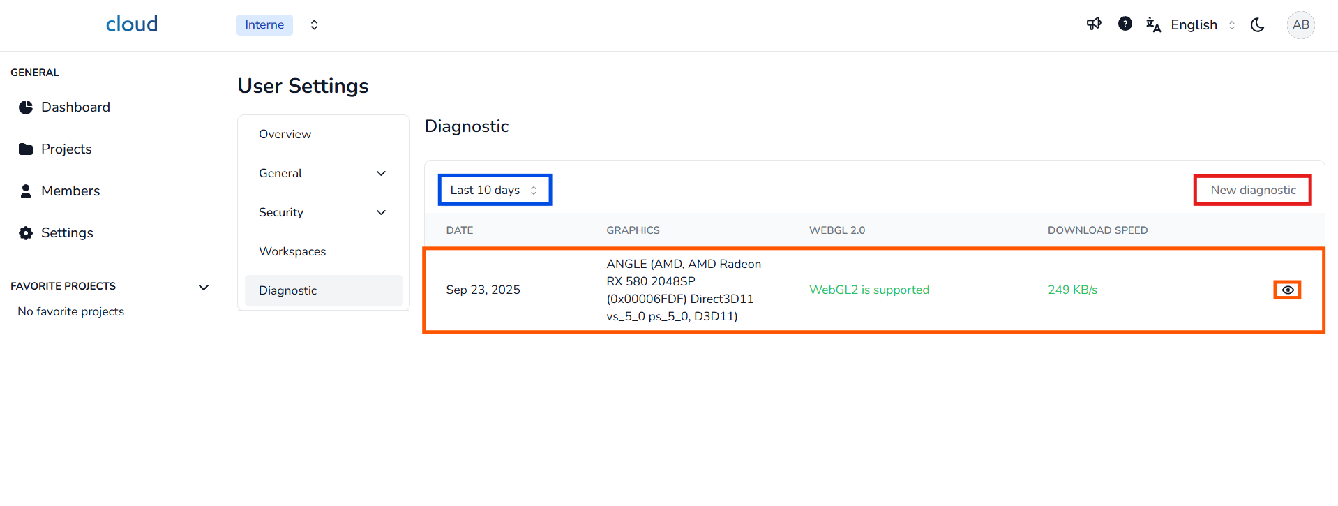 La sezione Diagnostica ti consente di verificare se il tuo dispositivo, browser e rete soddisfano i requisiti tecnici per navigare correttamente nell'Applicazione 3D.