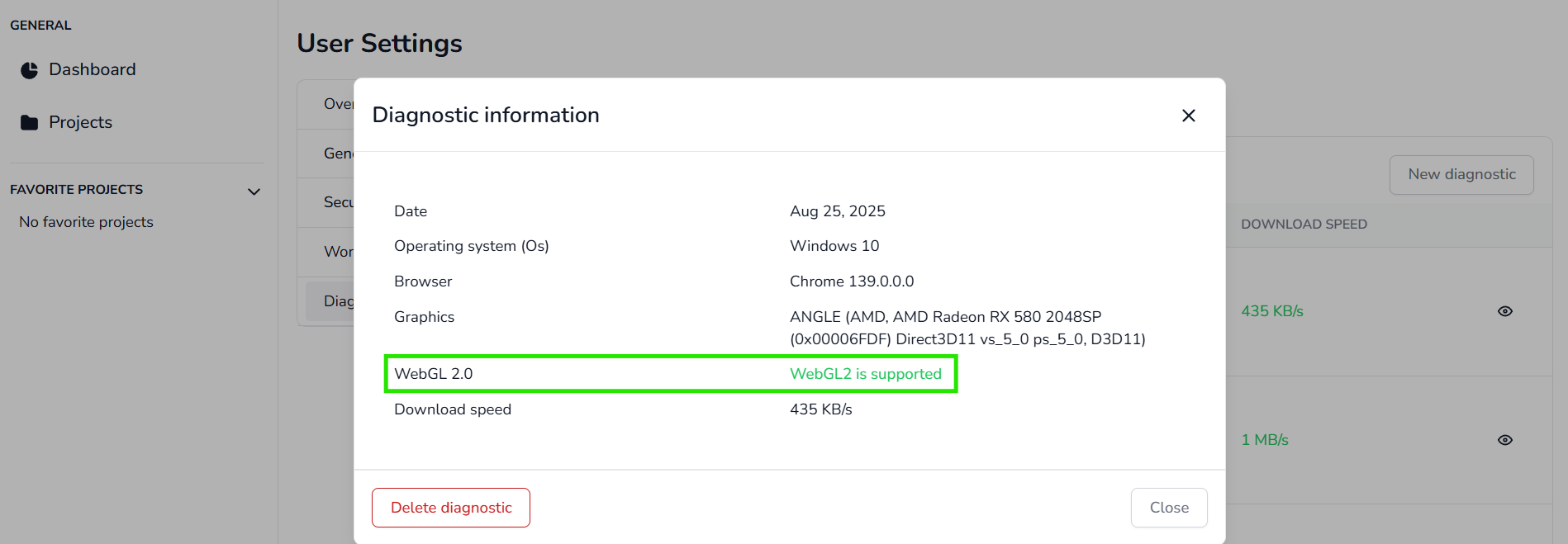 4. Torna alla pagina di diagnostica per verificare se WebGL2 è ora supportato