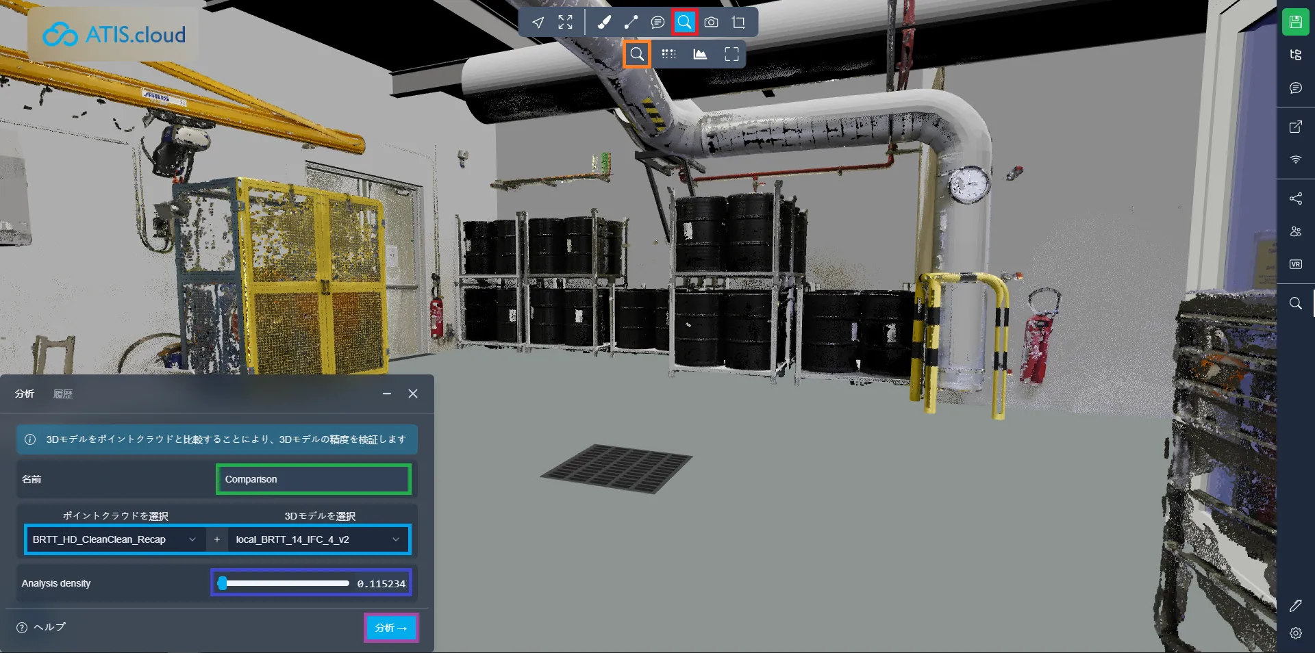 プロセスを開始する前に、分析ウィンドウでいくつかのアクションを実行する必要があります。まず、比較の名前を指定し、それがあなたとあなたのチームにとって意味のあるものであることを確認します。次に、比較する点群とモデルを選択します。最後に、分析密度を指定します。密度が低いほど精度は高くなりますが、時間がかかります。一方、密度が高いと精度が犠牲になり、結果が速くなります。よくわからない場合は、デフォルト設定のままにすることをお勧めします。