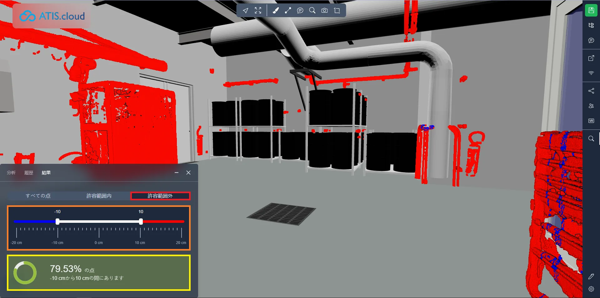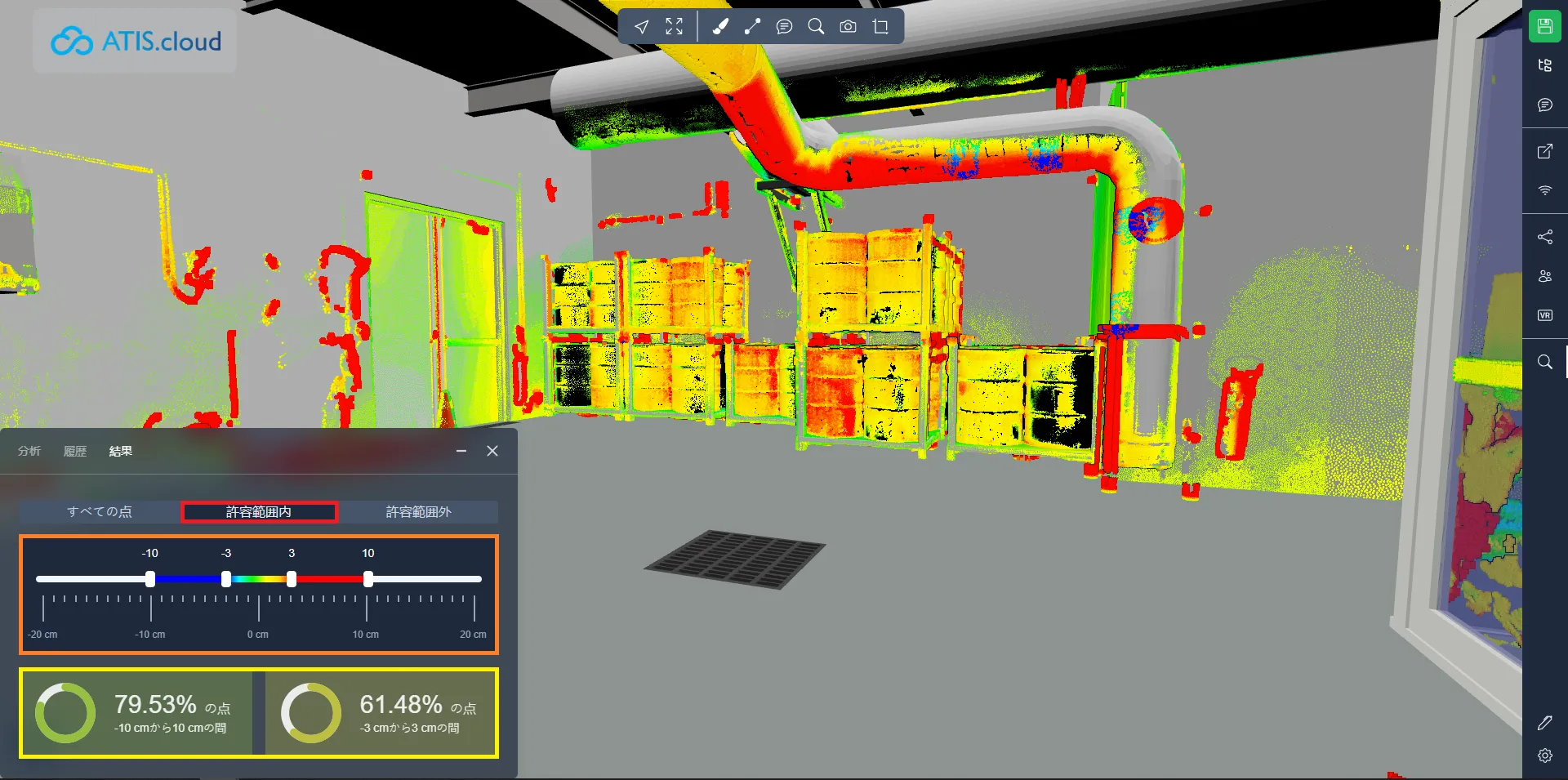 デフォルトのモードは「すべてのポイント」で、分析されたすべてのポイントが表示されます。許容値を調整するための 2 つのハンドルが付いたスライダーが表示されます。通常、デフォルトでは -3cm / +3cm に設定されています。これらの値は、ハンドルをドラッグするか、数値を直接入力することで調整できます。以下に、モデルと衝突するポイントの割合を示すパーセンテージが表示されます。たとえば、61.48% と表示されている場合、点群の 61.48% が正確にモデル化されていることを意味します。