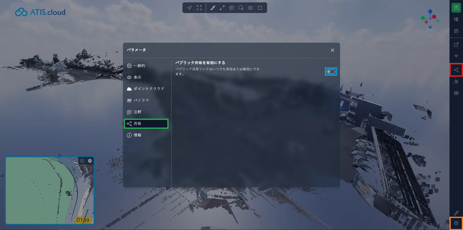 最後に、公開共有でミニマップを有効または無効にするかを決定できます。ミニマップを無効にしても、3Dアプリケーションにいるときにユーザーが再度有効にすることはできます。これはミニマップがデフォルトで有効または無効にすべきかを示すデフォルト設定にすぎません。