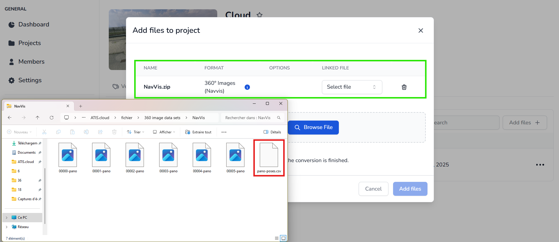 一部のケースでは、e57ファイルをお持ちの場合、e57ファイルをエクスポートする際のツールによっては360°画像が内部に含まれていることがあります. この場合、プラットフォームは360°画像を保持します (例えば、Cyclone Register 360はe57ファイルが構造化されていれば画像を保持し、NavVisやGeoslamもe57ファイル内の画像を保持します).