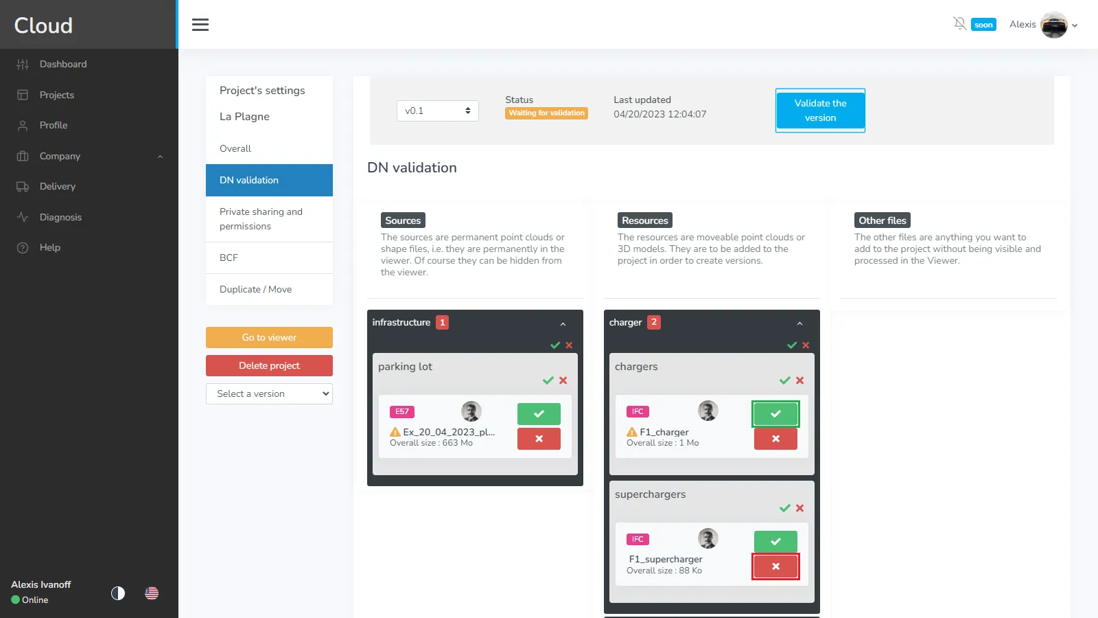 次に、DN 検証タブにアクセスします。ここには、ソース、リソース、その他のファイルを表す 3 つの列があります。各列では、ファイルはカテゴリ (暗いカード) およびドロップゾーン (明るいカード) ごとに編成されます。ここでファイル情報を確認できます。ファイルごとに、検証するかどうかを決定する必要があります。カテゴリ全体またはドロップボックスを一度に検証することもできます。各ファイルの処理を決定したら、バージョンを検証できます。