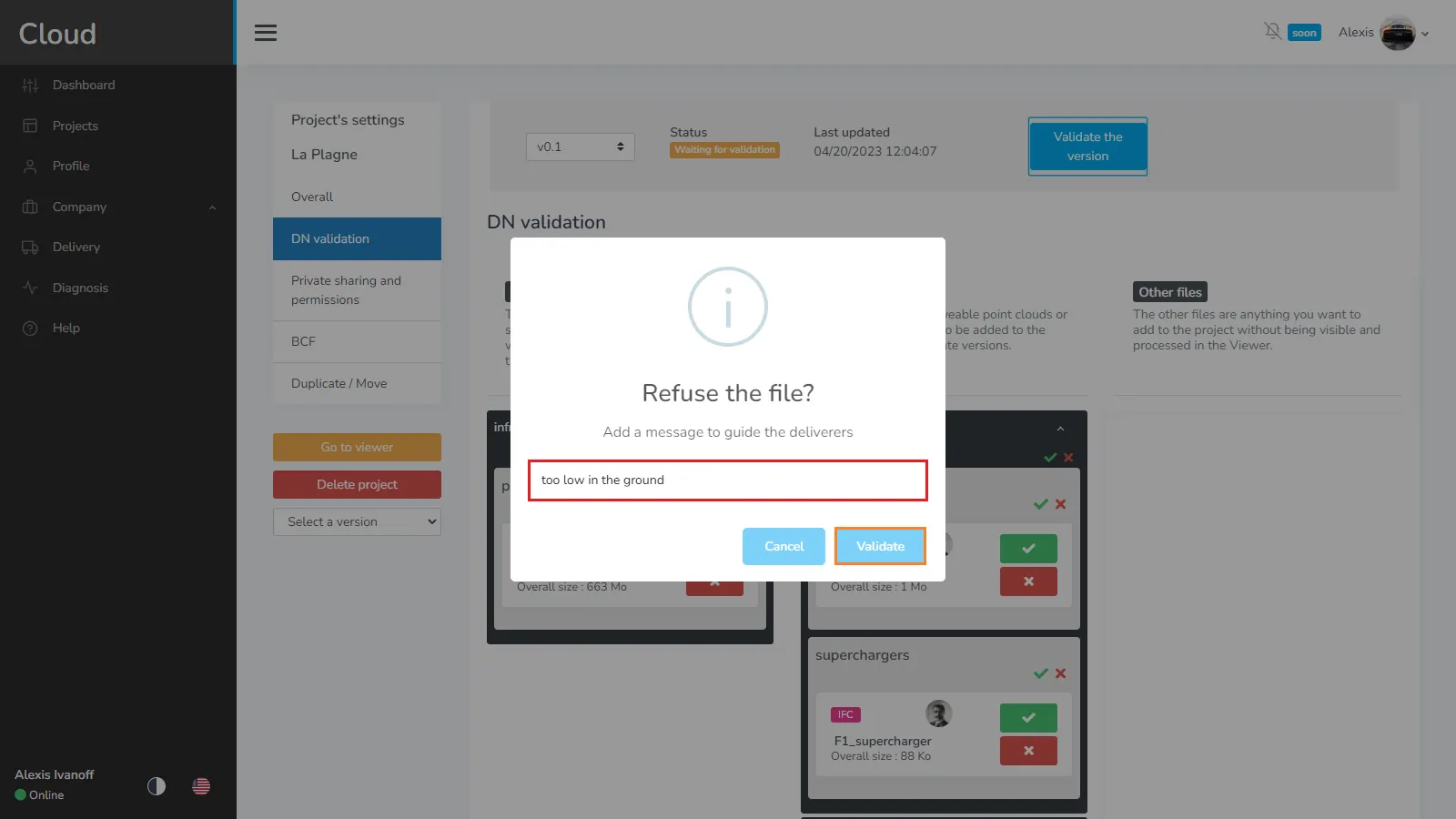 メジャー バージョンを検証する際には、2 つの選択肢があります。それを受け入れるか、プロジェクトを閉じて通常のプロジェクトに変換します。つまり、通常の方法でファイルをインポートできるようになります。これはデリバラーにも当てはまります。 。 DN プロジェクトが完了すると、DN モードに戻すことはできません。受け入れるには、テキストフィールドに「VALIDATE」と入力し、 「Validate」をクリックします。これにより、プロジェクトの各バージョンを要約した DN PDF がダウンロードされます。すべてのファイルを検証しながら、DN モードで開いたままにするために、ファイルを拒否することもできます。この選択はメジャー バージョンにのみ適用され、マイナー バージョンを検証しても DN モードは終了しません。