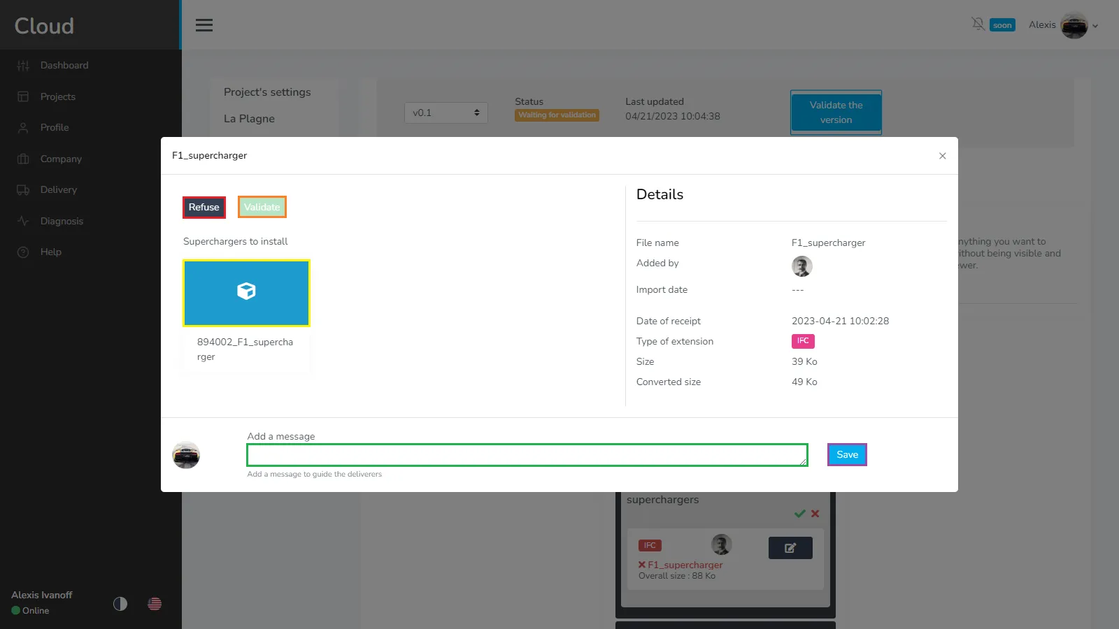 バージョンを検証することを決定すると、検証ウィンドウが開きます。 1 つ以上のファイルが拒否された場合、そのバージョンは拒否されます。次のバージョンは何か、最終更新日、更新者 (この場合は最後にファイルを送信した人) など、バージョンに関する情報が得られます。バージョンが拒否された理由を説明するメッセージを追加できます。また、問題の詳細を説明するにはファイルをドロップする必要があります。問題を示す画像を含む PDF を作成することをお勧めします。このバージョンを閉じるには検証を行ってください。