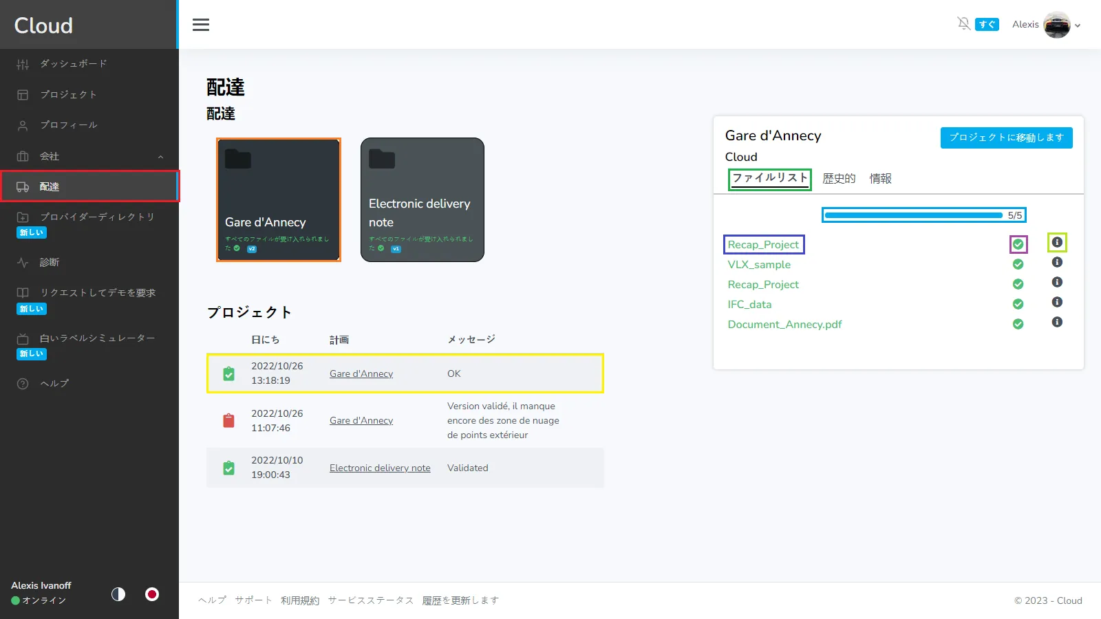 DN 概要ページには、現在 DN プロジェクトを進行中のすべての会社マネージャーがアクセスできます (受信側のみ)。そこには、現在 DN モードにあるすべてのプロジェクトが表示されます。いずれかをクリックして情報をロードします。以下に、すべてのプロジェクトに関する最新情報が表示されます。右側には、選択したプロジェクトに関するすべての情報が表示されます。ファイル リストタブには、プロジェクト内のすべてのファイル、合計のうち検証されたファイルの数、各ファイルの名前、状態、情報アイコン が表示されます。