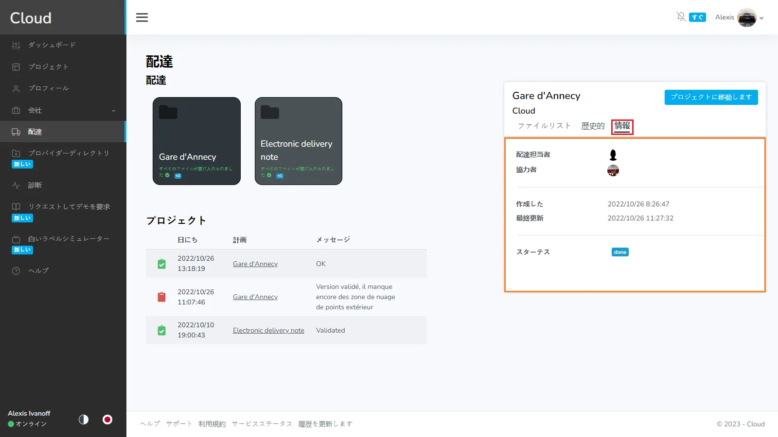 最後に、 [情報] タブには、プロジェクトに参加したユーザー、配信側か受信側か、プロジェクトの作成日と更新日、および現在のステータスの概要が表示されます。