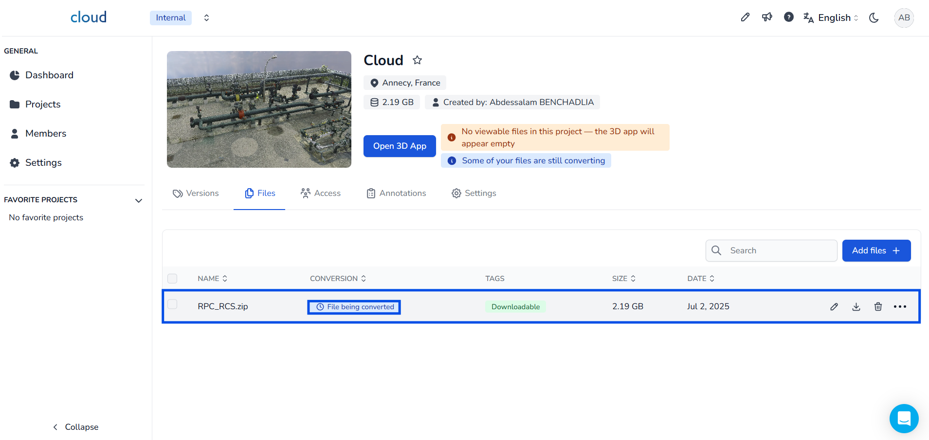 ReCap 프로젝트를 플랫폼에 가져오려면 데이터를 업로드할 프로젝트로 이동하십시오. 프로젝트 인터페이스의 파일 섹션에서 오른쪽 상단에 있는 파일 추가 + 버튼을 클릭하십시오. 그러면 가져올 파일을 선택하라는 창이 열립니다.