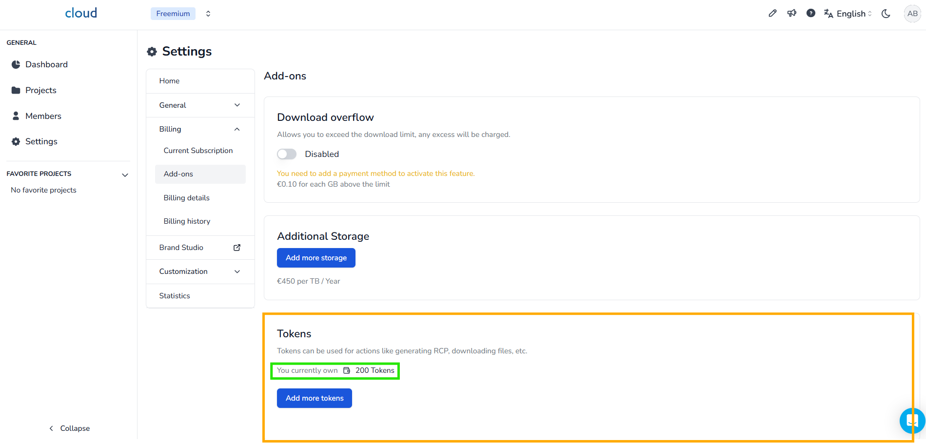 이 섹션에서는 현재 토큰 잔액을 확인할 수 있습니다. 토큰을 더 구매하려면 토큰 추가를 클릭하고 필요한 수량을 선택하십시오.