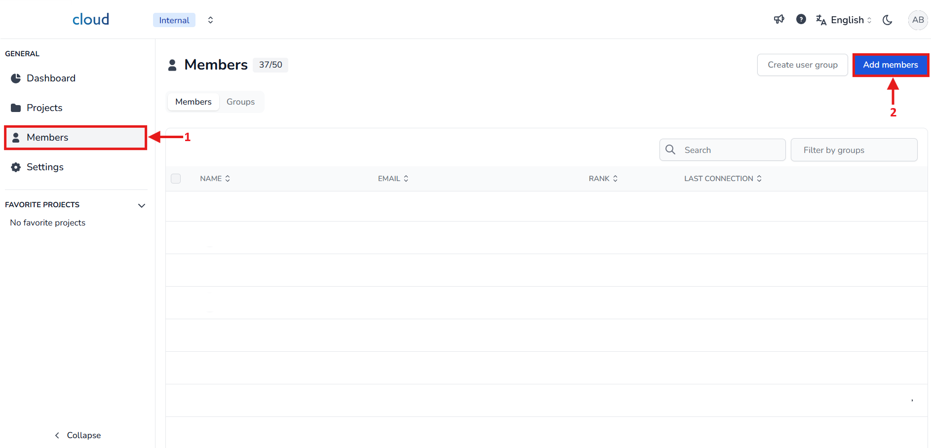 Primeiro, abra a janela Membros no menu lateral. Em seguida, clique em Adicionar membros para abrir a janela de convite.