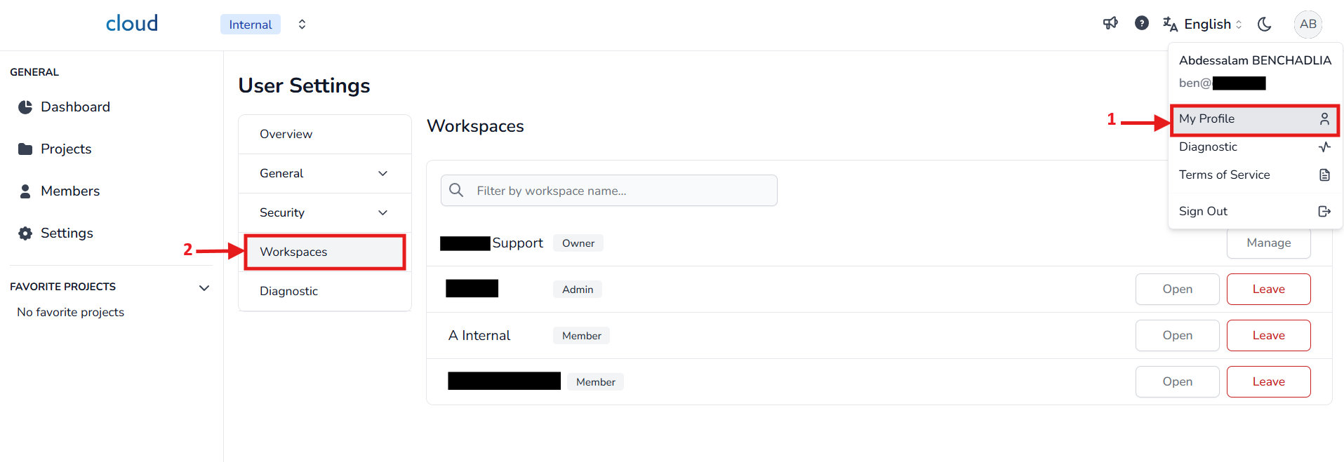 Você pode verificar seu papel indo em Seu Perfil > Espaços de Trabalho, onde seus papéis atuais serão exibidos para cada espaço de trabalho.